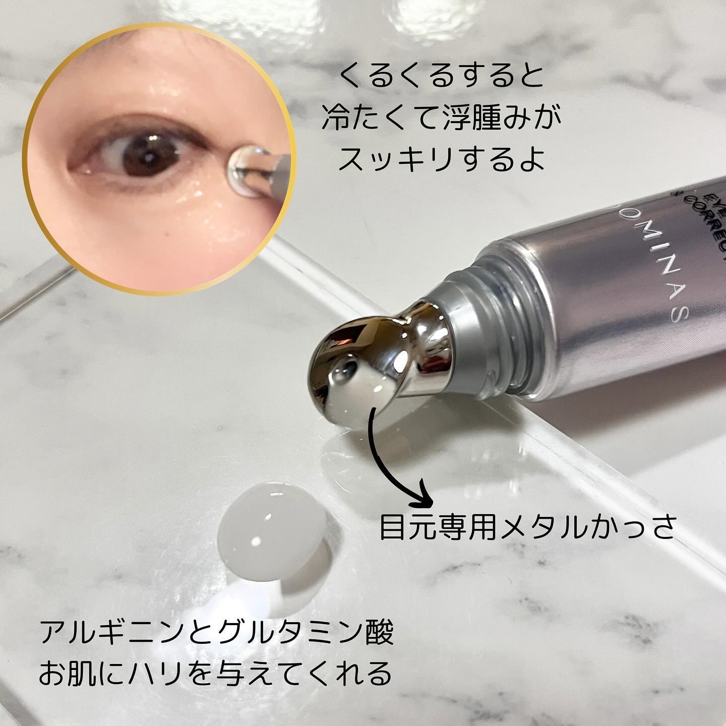 目元のたるみ11.5%緩和 ●目元のくすみ16.7%緩和 ●目元のクマ1.4%緩和 ハリのあるお肌のためにアルギニンとグルタミン酸を配合し、ハリのある肌ケア効果を持つ特許を取得した DOMINASならではのアルギニン-E™M 肌の疲れにアプローチし、目元のハリ感が手に入り、小じわにも効いた気がした✨✨