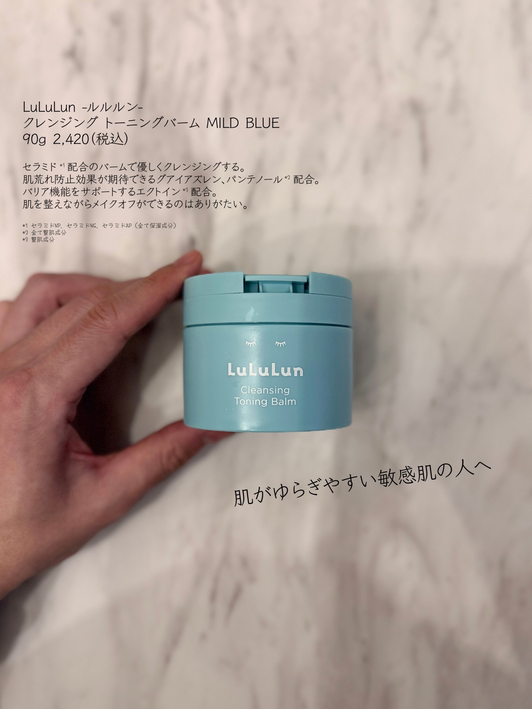 敏感肌向けのクレンジングバームです。肌質に合わせて選べる4種○ ほぐれてととのう、トーニングも叶うクレンジング。 水色の「MILDBLUE」は、ゆらぎがちで敏感な肌に。セラミドが配合されたバームでマイルドに落として敏感なお肌をちゅるんとすこやかに導いてくれます。 クレンジングもスキンケアの一部○ #ほぐれてととのうトーニングバームとして今回のリニューアルでは「落とす+整える」の成分設計。