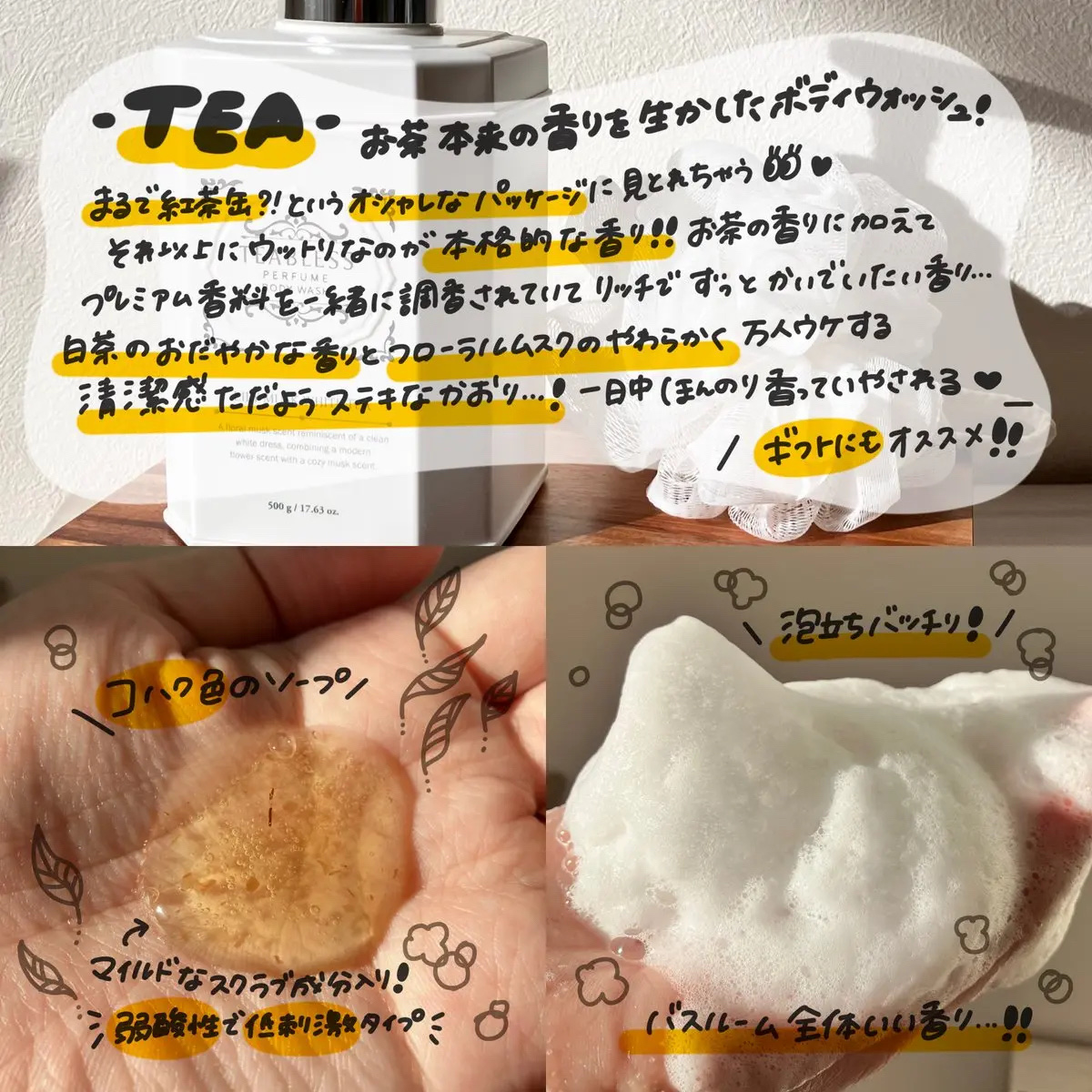 高級感のある香りとパッケージで華やかなボディケア✨TEABLESSパフュームボディローションリリームスクホワイトティープレミアム「TEA(茶)」の成分と香りの出会いから生まれたティーパフューム・パーソナルケアブランドとのこと。ホワイトティーと...