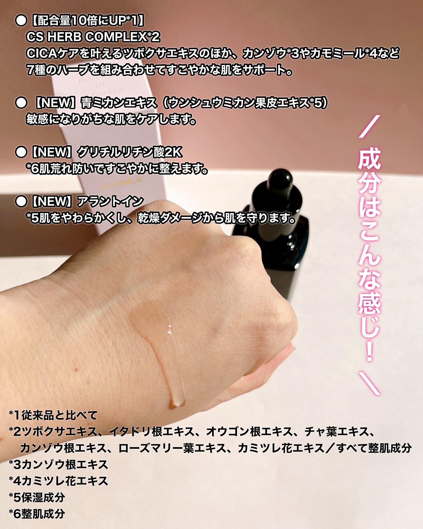 - <10ml> 水、BG、ペンチレングリコール、アスコルビルグルコシド、ナイアシンアミド、グリセリン、プロパンジオール、アルギニン、結晶セルロース、カプリリルグリコール、ヒアルロン酸Na、ラウリン酸ポリグリセリル-10、ミリスチン酸ポリグリセリル-10、アラントイン、グリチルリチン酸2K、セルロースガム、アデノシン、ウンシュウミカン果皮エキス、カンゾウ根エキス、ツボクサエキス、カラスムギペプチド、ダイズペプチド、チャ葉エキス、イタドリ根エキス、バクガエキス、マデカッソシド、オウゴン根エキス、サフラワー油、カミツレ花エキス、デシルグルコシド、ローズマリー葉エキス、ビサボロール、トコフェロール、マツリカ花エキス、ローズ油 <30ml> 水、BG、ペンチレングリコール、アスコルビルグルコシド、ナイアシンアミド、グリセリン、プロパンジオール、アルギニン、結晶セルロース、カプリリルグリコール、ヒアルロン酸Na、ラウリン酸ポリグリセリル-10、ミリスチン酸ポリグリセリル-10、アラントイン、グリチルリチン酸2K、セルロースガム、アデノシン、ウンシュウミカン果皮エキス、カンゾウ根エキス、ツボクサエキス、カラスムギペプチド、ダイズペプチド、チャ葉エキス、イタドリ根エキス、バクガエキス、マデカッソシド、オウゴン根エキス、サフラワー油、カミツレ花エキス、デシルグルコシド、ローズマリー葉エキス、ビサボロール、トコフェロール、マツリカ花エキス、ローズ油 <50ml> 水、BG、ペンチレングリコール、アスコルビルグルコシド、ナイアシンアミド、グリセリン、プロパンジオール、アルギニン、結晶セルロース、カプリリルグリコール、ヒアルロン酸Na、ラウリン酸ポリグリセリル-10、ミリスチン酸ポリグリセリル-10、アラントイン、グリチルリチン酸2K、セルロースガム、アデノシン、ウンシュウミカン果皮エキス、カンゾウ根エキス、ツボクサエキス、カラスムギペプチド、ダイズペプチド、チャ葉エキス、イタドリ根エキス、バクガエキス、マデカッソシド、オウゴン根エキス、サフラワー油、カミツレ花エキス、デシルグルコシド、ローズマリー葉エキス、ビサボロール、トコフェロール、マツリカ花エキス、ローズ油