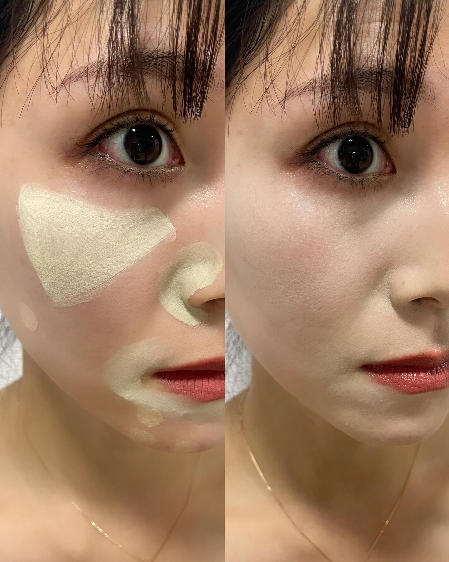 元々あったベージュに加えて、ラベンダー、ミントの2色が新しく出たよ✨ 水分ベースにグリーントーンの鎮静パウダーを加え、色とりどりに赤くなったお肌を補正してくれるミントトーンアップエッセンス💡 私は肌の赤みが強いから、グリーンベース使うと赤みが引いていい感じ✨ みずみずしく密着度の高いテクスチャーで時間が経つほど肌に馴染んで長時間キープしてくれるからすごくいい感じ⭐️ ベージュも自然に美肌に見せてくれるから気に入ってたけど、補正機能のついたミントも使いやすくてヘビロテの予感💗 これ一本あるだけで肌のカラーコントロールができるからすっぴん風メイクもしっかりメイクも🙆♂️