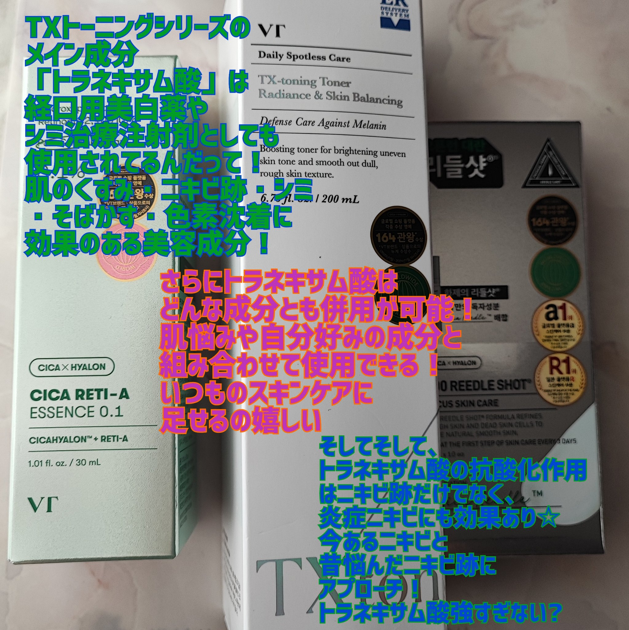 TXトーニング発売4ヶ月で40万個突破記念のモニターに当選していただきました⭐️ 高濃度のトラネキサム酸が肌を明るく整えてくれます⭐️ 美容針がその後のスキンケアの浸透率をUP!シカレチは優しく角質ケアをしつつ、レチノールでシミ・シワをケアしてくれる⭐️