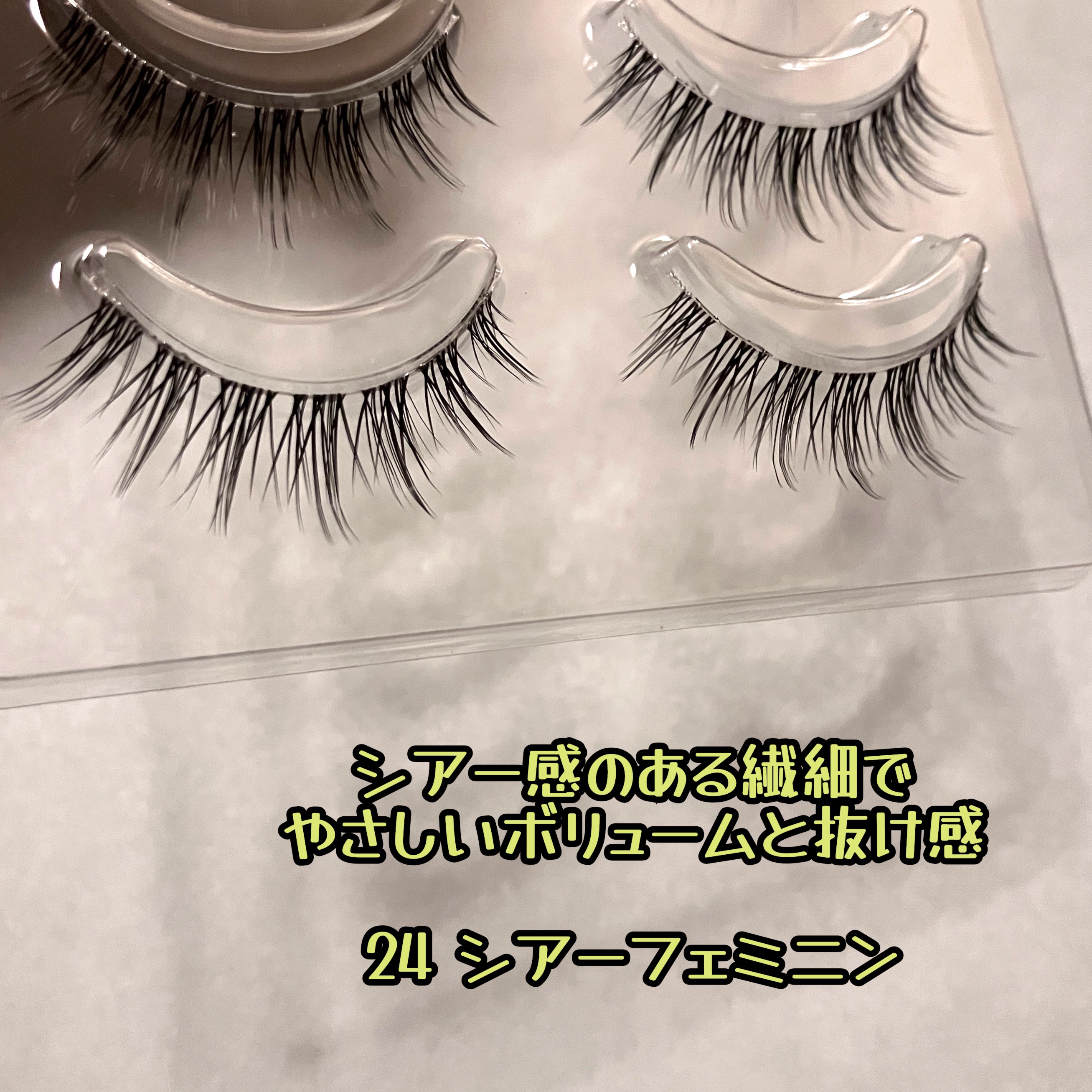 流行りの束感まつげが簡単につけられちゃう! 全22種類の豊富なラインナップでして24 シアーフェミニンを使ってます。 思ってたよりも使い心地◎。目がぱっちりしてみえるのが良いですね!