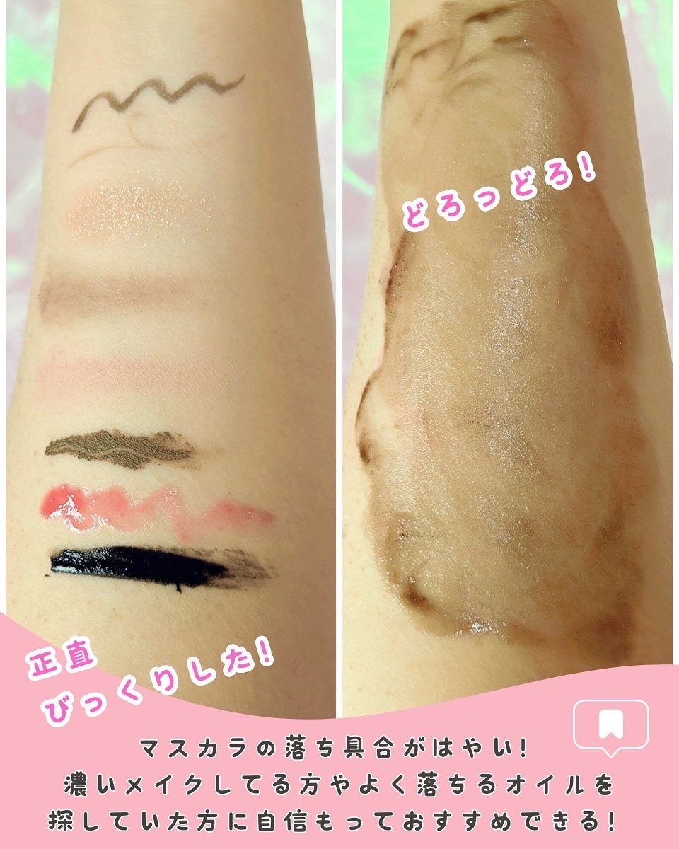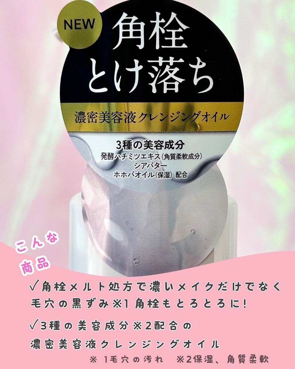 3種の美容成分配合の濃密美容液クレンジングオイル。発酵ハチミツエキス・ホホバオイル・シアバター) 角栓メルト処方でウォータープルーフマスカラなどの濃いメイクだけでなく毛穴の汚れ・角栓も溶かして落とします。 使用感もメイク落ちもめっちゃ良く、濡れた手OK、W洗顔不要、ポンプ式とお気に入りポイントも沢山あってかなり推せる🫶🏻