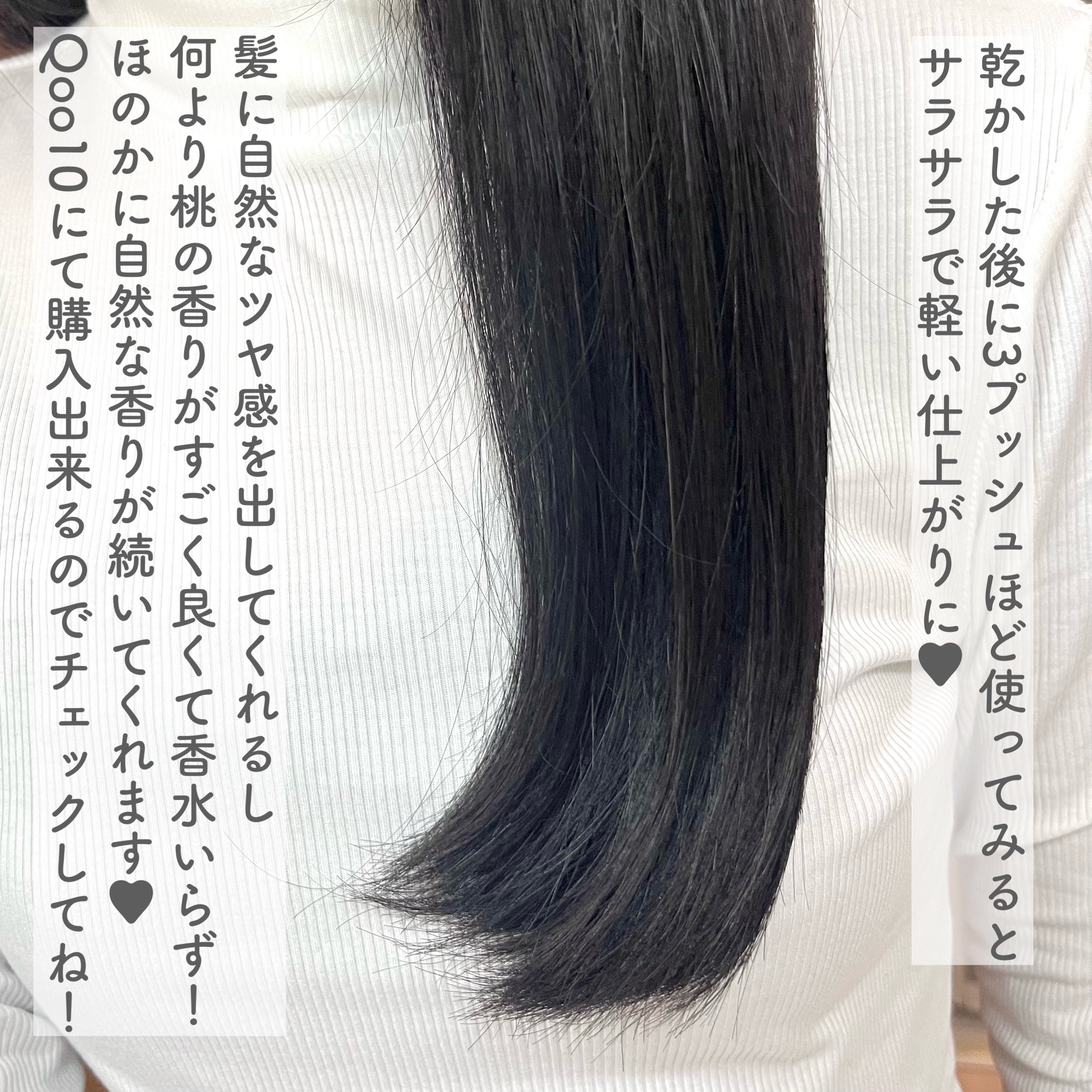 10種の自然由来オイルブレンドで傷んだ毛先をコーティング。 ベタベタ、ぺたっとしない使い心地がすごくいいんです。しっとりだけどサラサラになります。 フローラルピーチの香りもジューシーでさわやか♡