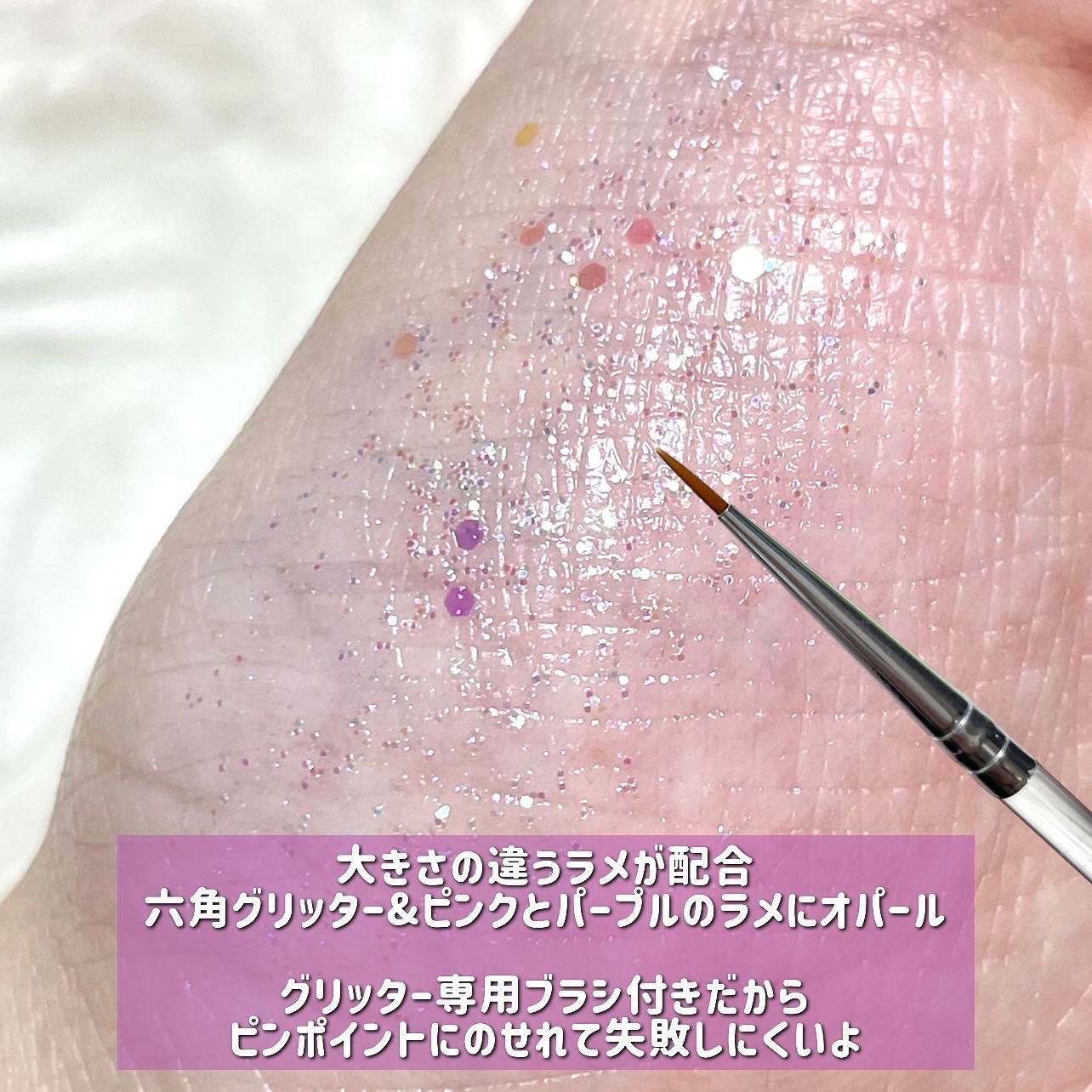まるで塗る宝石💎💎💎 ピンクとパープルの細かいラメにオパールがめっちゃかわいい♡ 角度によって輝きもかわる! うるっとした目元になるよ🌟 密着ウォーターベースでぴたりと密着! 付属の0.9mmのブラシが使いやすかったよ♡