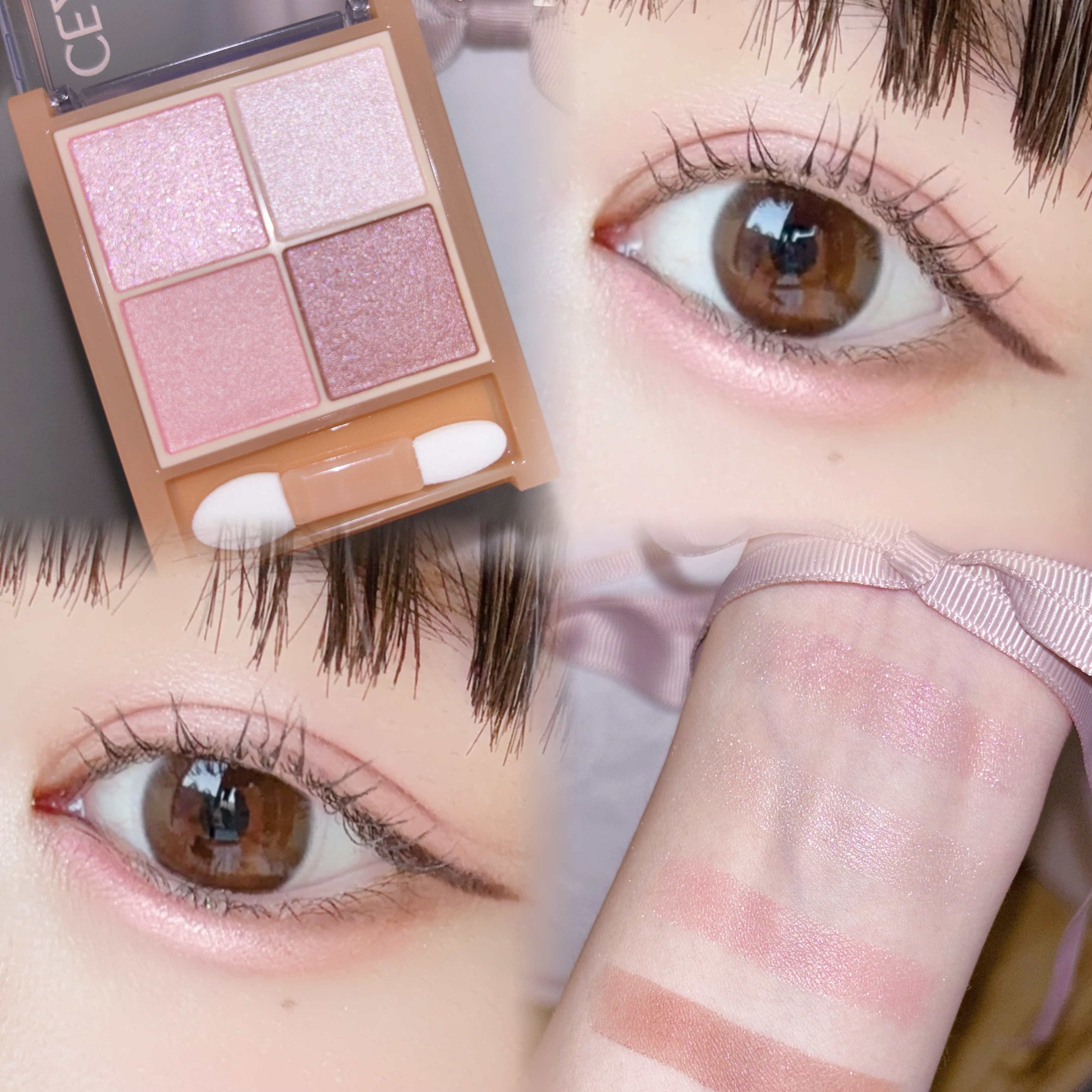 - ラメ・パール・マット3質感の4色アイシャドウ。 肌馴染みの良いベージュを基調としたカラー。ラメ・パール・マットの3質感を重ねて、自然にまぶたを強調し奥行のある大きな目元へ。 しっとり溶け込むような柔らかなパウダーなので、スルスル伸びてまぶたにピタッと密着。保湿成分(スクワラン・ホホバ種子油)配合。