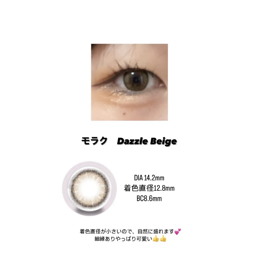 特にダズルグレー・ベージュは着色直径が小さいので、目が小さめの人でも宇宙人にならずに済みます👽💦 モラクのカラコンはどれも可愛くて、盛れるので とっても👍👍👍👍 Qoo10メガ割中はとってもお得に買えるので 買うなら今ですよ‼️