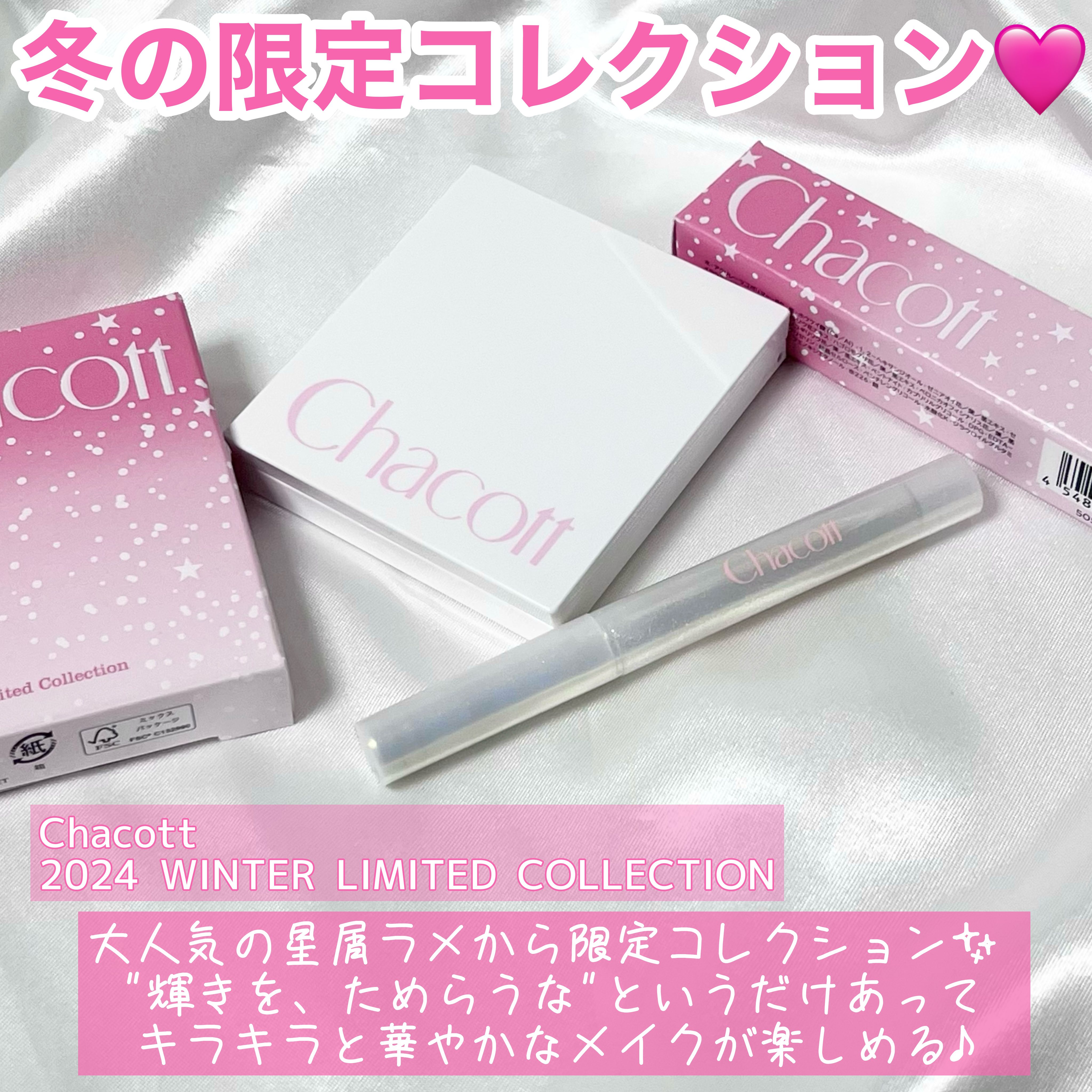 チャコットの冬期限定アイテムがかわいい🥺🎄.* 2024 WINTER LIMITED COLLECTION 🤍フェイスカラーパレットEX【516】煌めきに包まれた限定コレクション✩.*˚ アイブロウとしても使えるパレット🙌🏻 ピンクラメとブラウンの相性がいい!チークのピンクもかわいくて、お気に入り💗 発色、ラメ感、落ちにくさを追求したリキッドアイライナー。 ウォータープルーフ&スマッジプルーフ処方で摩擦に強い速乾タイプ。