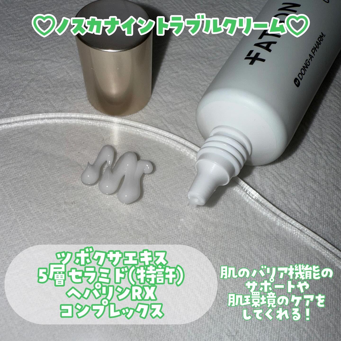 韓国の製薬会社『東亜製薬』で9年間研究開発して作られたノスカナインライン︎︎𓂃🪴 独自開発した有効成分伝達技術【ラピッドサムテクノロジー™】でニキビ、トラブルで敏感になった肌を素早く鎮静させる🍃 ややとろみがあってやさしく肌を包み込んでくれるようなテクスチャーが好き🤲🏻 2度ほど重ね付けするともっちりとした肌に🤍 みずみずしい伸びの良いクリーム🫧 軽くさっぱりしているのにしっかり保湿感がありしっとり肌に🕊 出し口が細いので塗りたいところにピンポイントで塗れるところも良い◎