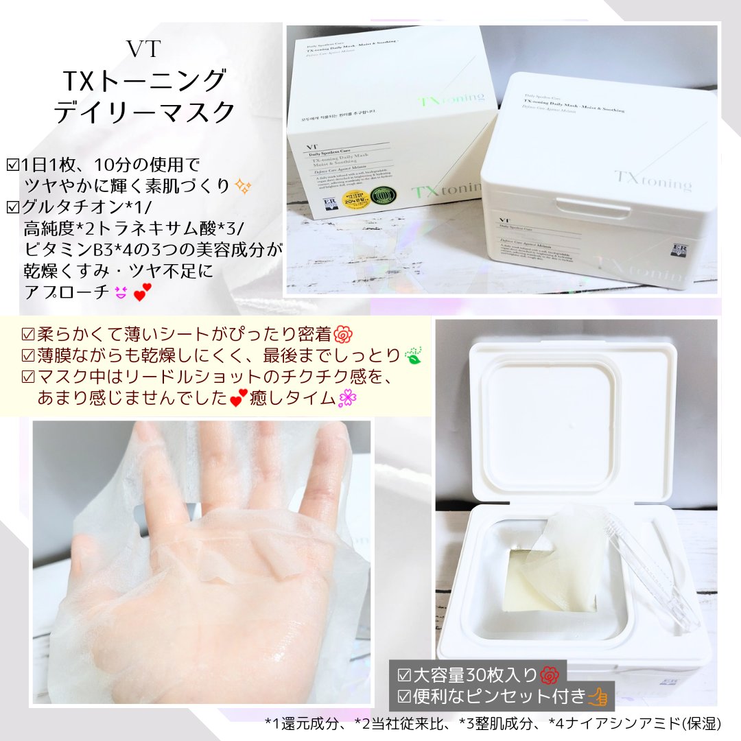 VT史上初の最大割引でお得すぎるセットになってます🉐 TXトーニングは高純度&高含量のトラネキサム酸をメイン成分としており、透明感・乾燥くすみ・トラブル跡のケアをしたい人にぴったりなスキンケアライン🤍 リードルショットの有無・肌悩みに合わせて4種類からエッセンスを選べるようになっています✨ なんと新作のグルカミューンエッセンスも選択可能です😳🐌 ボリューム満点でお得感すごいですよね🤭 さらに11/16までは35%OFFのクーポンもあるのだとか💖