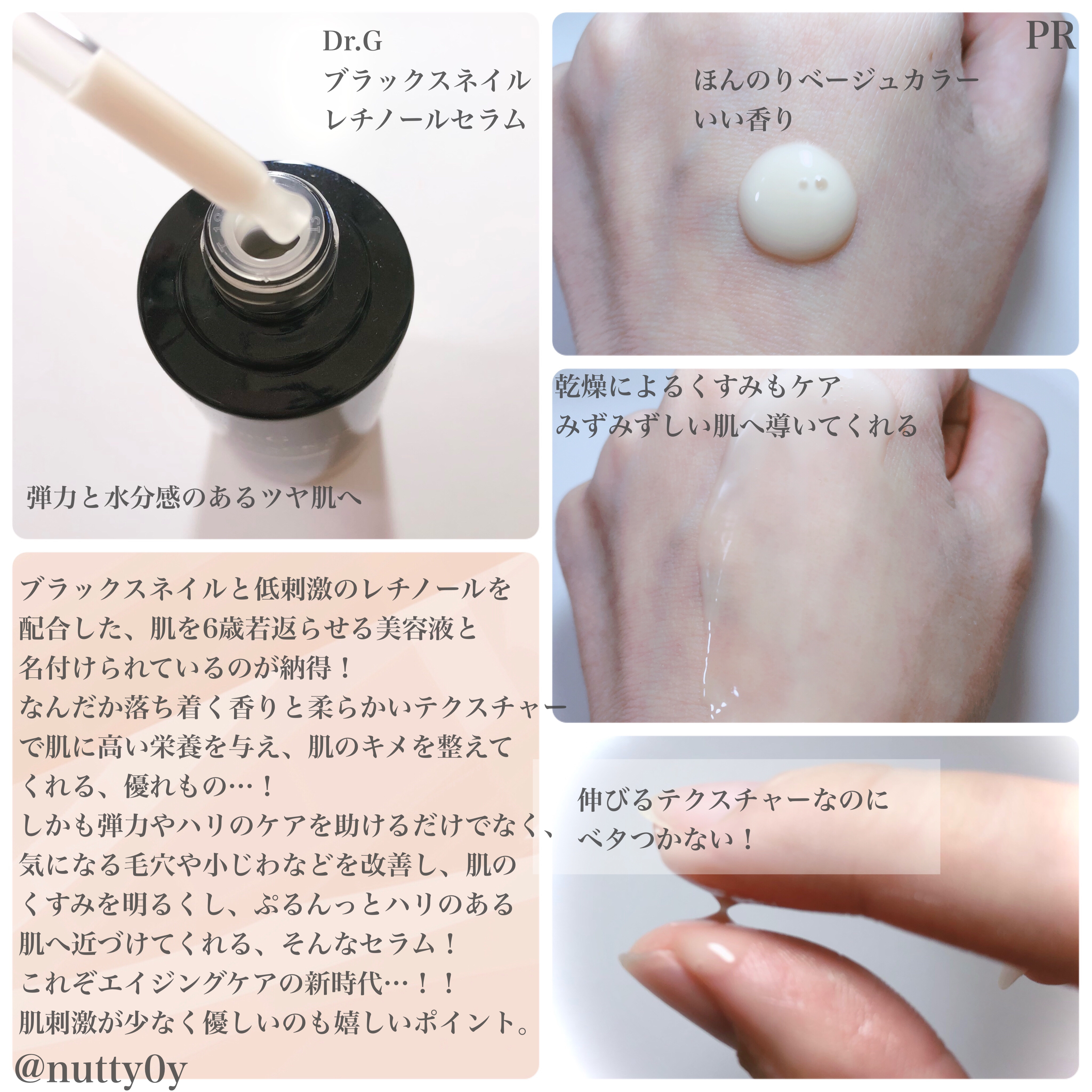 ブラックスネイルレチノールセラムは、ブラックスネイルと低刺激のレチノールを配合した美容液👏✨ 従来のレチノールの特徴、第1世代の効果は高いけど刺激の強いレチノール、第2世代の効果は低いけど刺激の少ないレチノールの長所だけを活かして、刺激が少なく効果の高い第3世代レチノールと、ブラックスネイルを配合した、ブラックスネイルレチノールという成分をDr.Gが独自開発😍💓 濃厚な美容液で、ぷるんっとツヤ感のある肌づくり💗