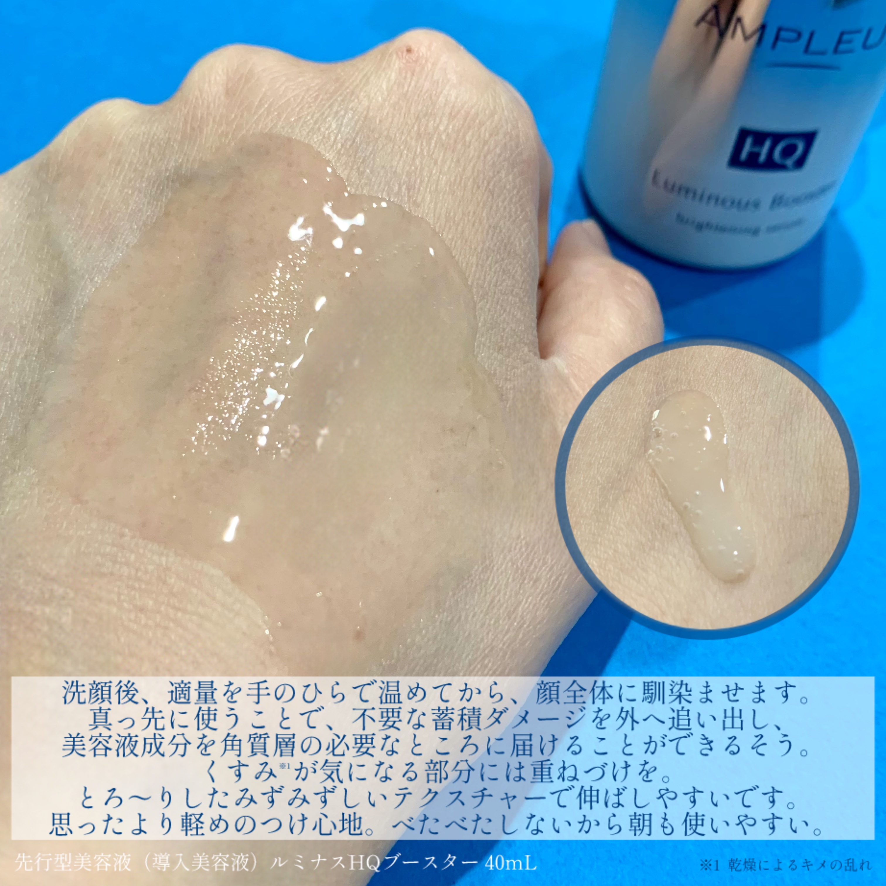 *アンプルールルミナスHQブースター気になるしつこいくすみの元を断つ先行型美容液(導入美容液)洗顔後に3プッシュを手に取り顔全体に馴染ませて使用していますとろみのあるテクスチャーですが伸びが良く肌馴染みがとても良く次のプロセスのスキンケアが...