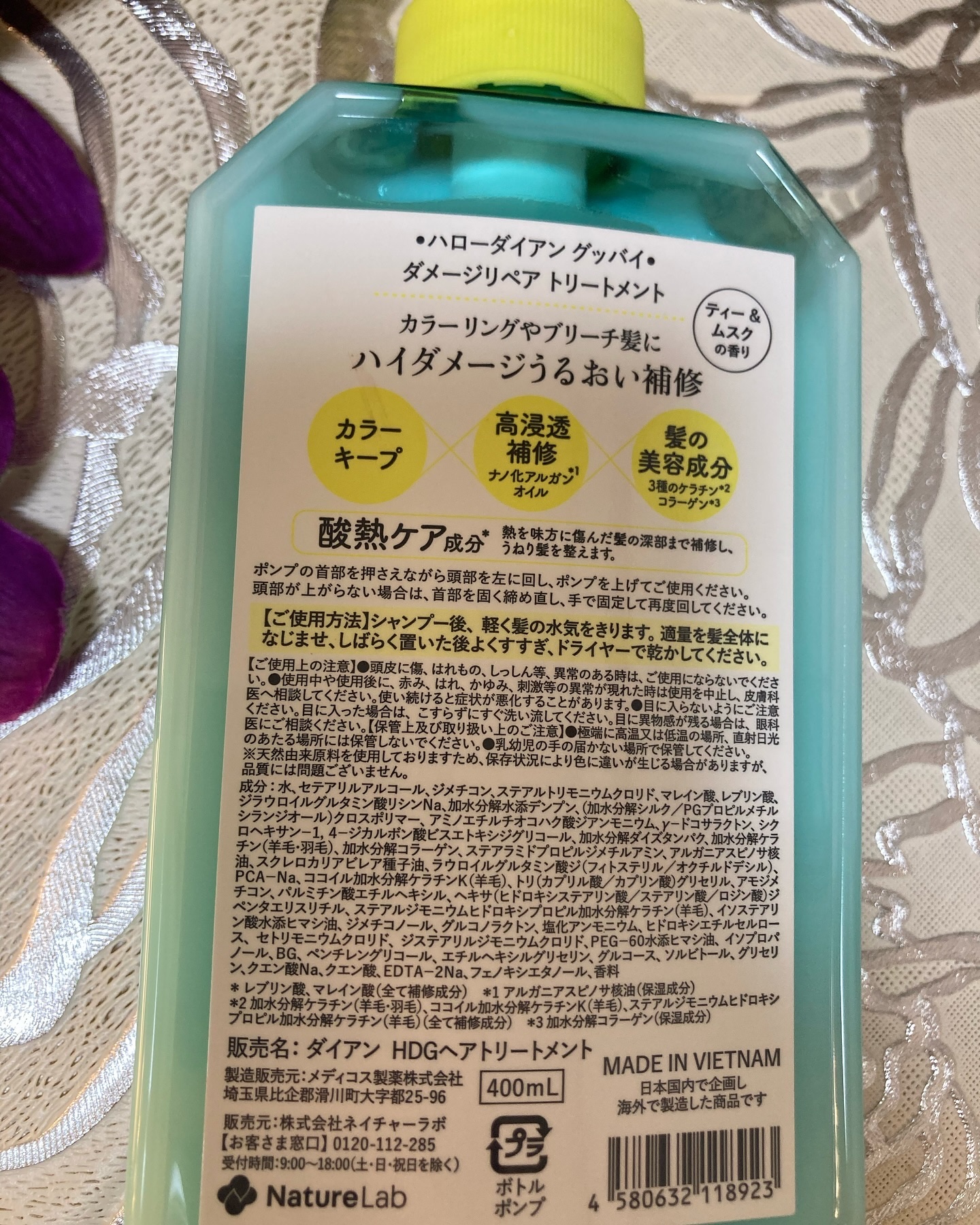 カラーリングやブリーチ髪も毛先までハイダメージうるおい補修してくれるんだって ティー&ムスクの香り💐 パッケージの華やかさに目がとまります💓 かわいい🌼*°ほのかに香っていい匂い💕 泡立ちも良くて使い心地がいいです🌠 ヘアミルクはクセやうねりにいいそうでべたつかなくて使いやすい☆