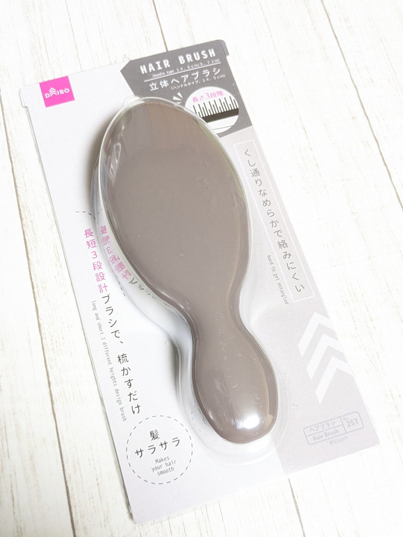 DAISO立体ヘアブラシ何年か前に“タン○ルティーザー”のジェネリック的存在として登場したダイソーのブラシがボロボロになったので新調。前は水色だったけど今回は落ち着いたトープカラーがおされ!朝起きた時に毛流れを整えるのに使うことが多いです✨大...