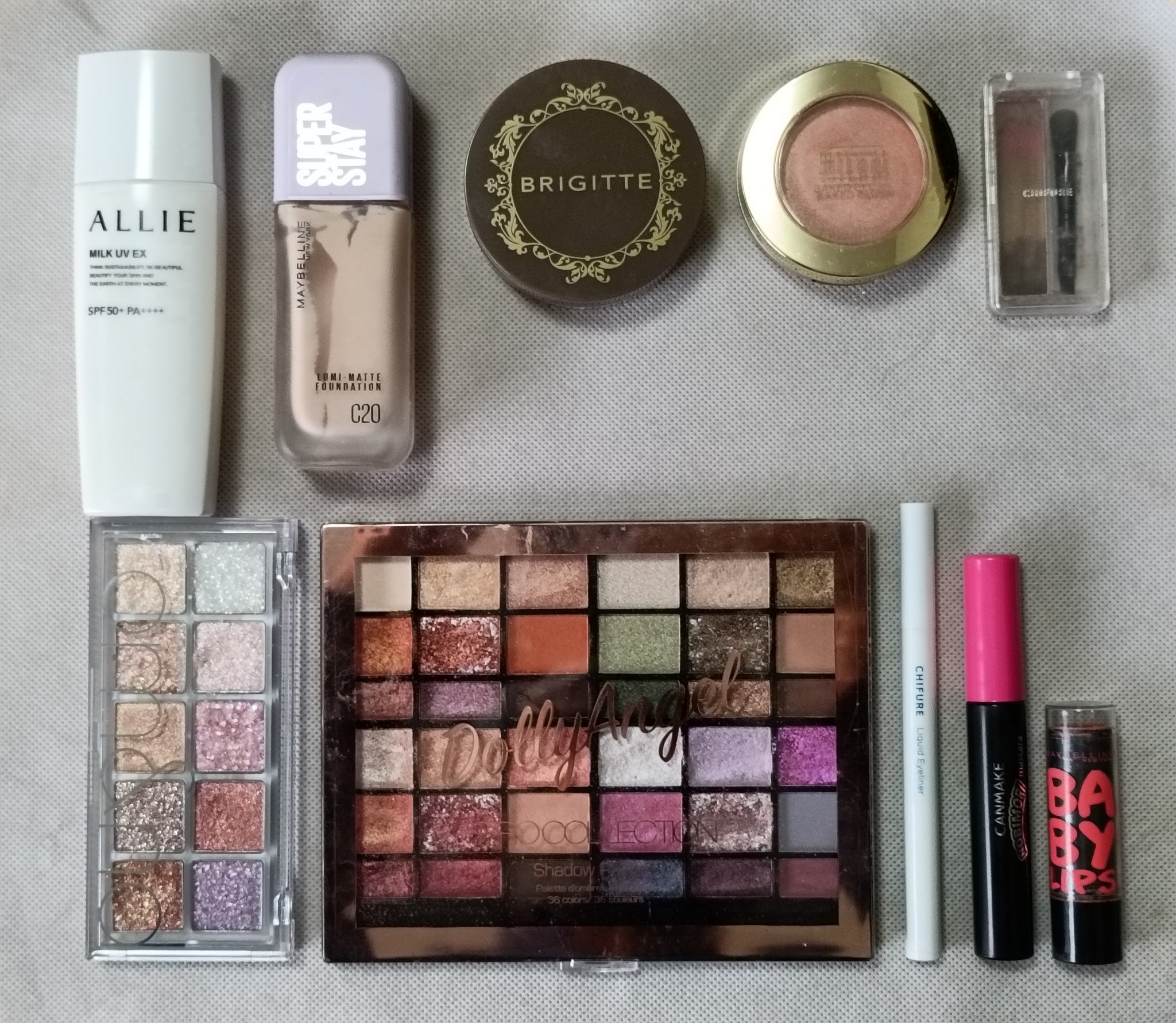 アリィー ニュアンスチェンジUV ジェル RSを、顔全体にまんべんなく塗ります。 RMK RMK ジェルクリーミィファンデーション 103を、顔全体にまんべんなく塗ります。 ジョンソンベビー ジョンソン ベビーパウダーを、顔全体にまんべんなく軽くはたきます。 THE BODY SHOP bronze shade warm glowを、両頬に塗ります。 KATE リフレクトミラーアイズ BR-1の締め色を、眉毛全体にまんべんなく塗ります。 URGLAM UR GLAMBLOOMING EYE COLOR PALETTE 01を、使用しました。 ちふれ リキッド アイライナー 筆ペンタイプ BK30 ブラックを、塗ります。 CEZANNE エアリーカールマスカラを、まつ毛全体にまんべんなく塗ります。 MAYBELLINE NEW YORK コロッサルボリュームエクスプレスを、まつ毛全体にまんべんなく塗ります。 MAYBELLINE NEW YORK SPステイ マットインク 135を、唇全体にまんべんなく塗ります。