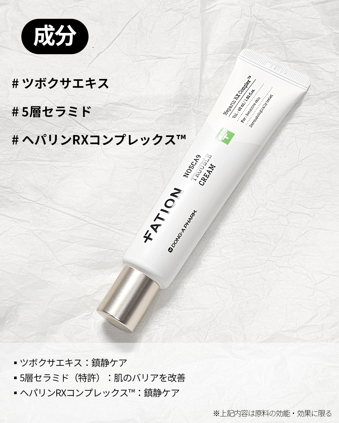 - <45ml> 水、ペンチレングリコール、BG、グリセリン、ジグリセリン、キサンタンガム、スクワラン、ステアリン酸、エチルヘキシルグリセリン、ツボクサエキス、DPG、ステアリン酸グリセリル、セテアリルアルコール、イソドデカン、水添レシチン、ステアリン酸ポリグリセリル-10、セラミドNP、ステアリルアルコール、(アクリル酸ヒドロキシエチル/アクリロイルジメチルタウリンNa)コポリマー、コレステロール、セラミドAP、フィトスフィンゴシン、セラミドEOP、クロレラエキス、パンテノール、1,2-ヘキサンジオール、アラントイン、イソステアリン酸ソルビタン、(アクリレーツ/アクリル酸アルキル(C10-30))クロスポリマー、(アクリロイルジメチルタウリンアンモニウム/VP)コポリマー、ステアロイルグルタミン酸Na、トリ(カプリル酸/カプリン酸)グリセリル、テトラエチルヘキサン酸ペンタエリスリチル、グルコース、ヨモギ葉エキス、コハク酸、(カプリリル/カプリル)グルコシド、(ジメチコン/ビニルジメチコン)クロスポリマー、ツボクサ葉エキス、メドウフォーム種子油、フルクトース、ヒドロキシアセトフェノン、ステアリン酸ポリグリセリル-2、クエン酸ステアリン酸グリセリル、セラミドAS、β-グルカン、オリーブ油脂肪酸セテアリル、オリーブ油脂肪酸ソルビタン、セラミドNS、(ビニルジメチコン/メチコンシルセスキオキサン)クロスポリマー、フィチン酸Na、ビニルジメチコン、フルクトオリゴ糖、ジステアリン酸ポリグリセリル-3、水添コメヌカ油