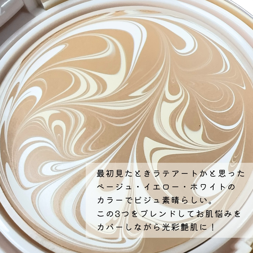- ●美容保湿成分90.7%ビタミンC誘導体配合* 美容液を配合したなめらかなつけ心地 ●3色のラテアートの絶妙な色合い こだわりの色合いで、悩みをカバーしながら光彩ツヤ肌を演出 *3ーOーエチルアスコルビン酸(製品の抗酸化剤 )