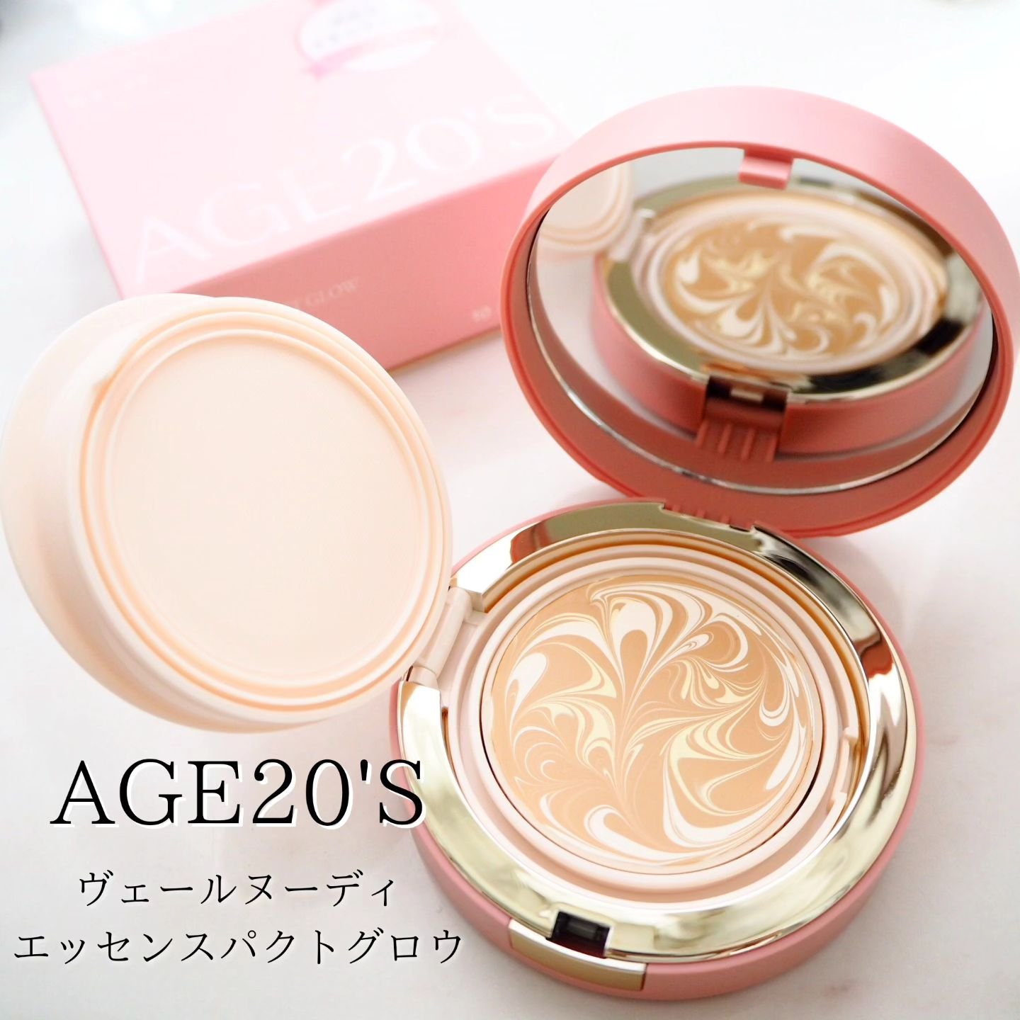 長時間乾燥知らず!ツヤ肌誕生❣️ AGE20’Sヴェールヌーディパクト カラーは10オークル♡ 使用感はしっとり潤い感 独自研究所で開発したコア技術「エッセンスポケット」を採用してるんだって 贅沢に美容液も配合しているからスキンケア感覚の美容液ファンデなの⭕️