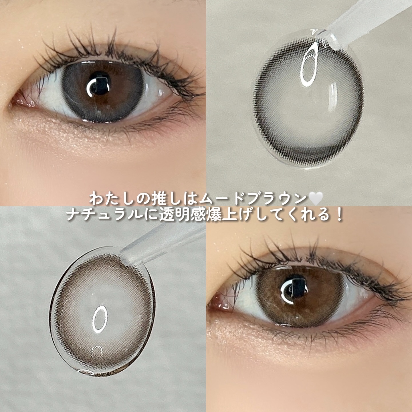 アッシュカラーで大人可愛い目もとを演出してくれるアッシュカラコン。真ん中までふんわり広がるグラデーションフチで、自然に溶け込む感じ。 ムードブラウンはほんのりくすんだニュートラルなブラウンで透明感を演出。ムードグレーはほんのり青みがかったグレーで神秘的な雰囲気。 どちらもふんわりとした印象で透明感が出るのもお気に入り🪽