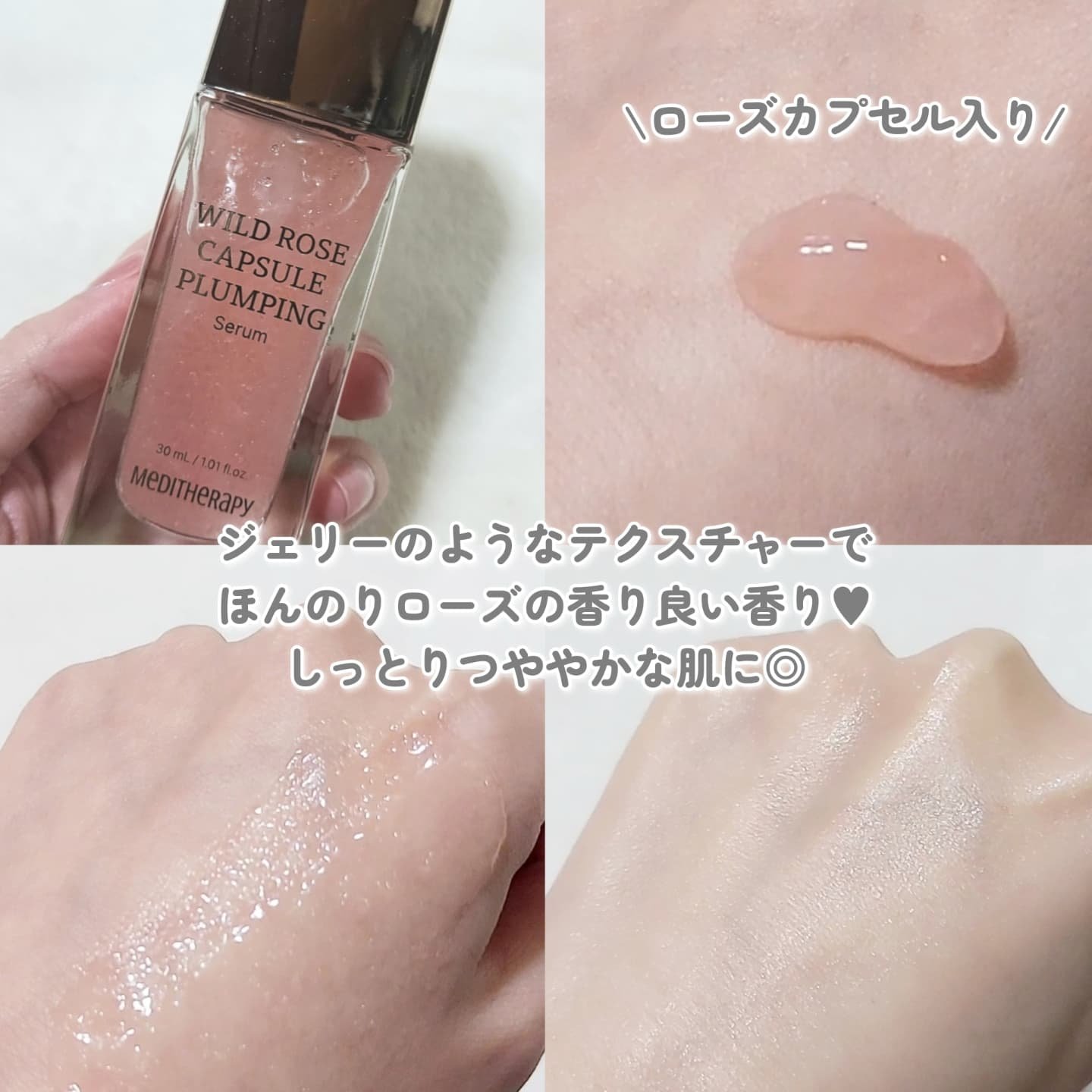 くすみやハリのなさが気になる方に💓 高級感のあるパッケージも素敵なメディテラピーの美容液✨️ テクスチャーはジュレのような感じ! ローズオイルカプセルは違和感なく肌に馴染んでいった🙆♀️ ほのかに薔薇の香りがして 心地よくスキンケアできた🌹