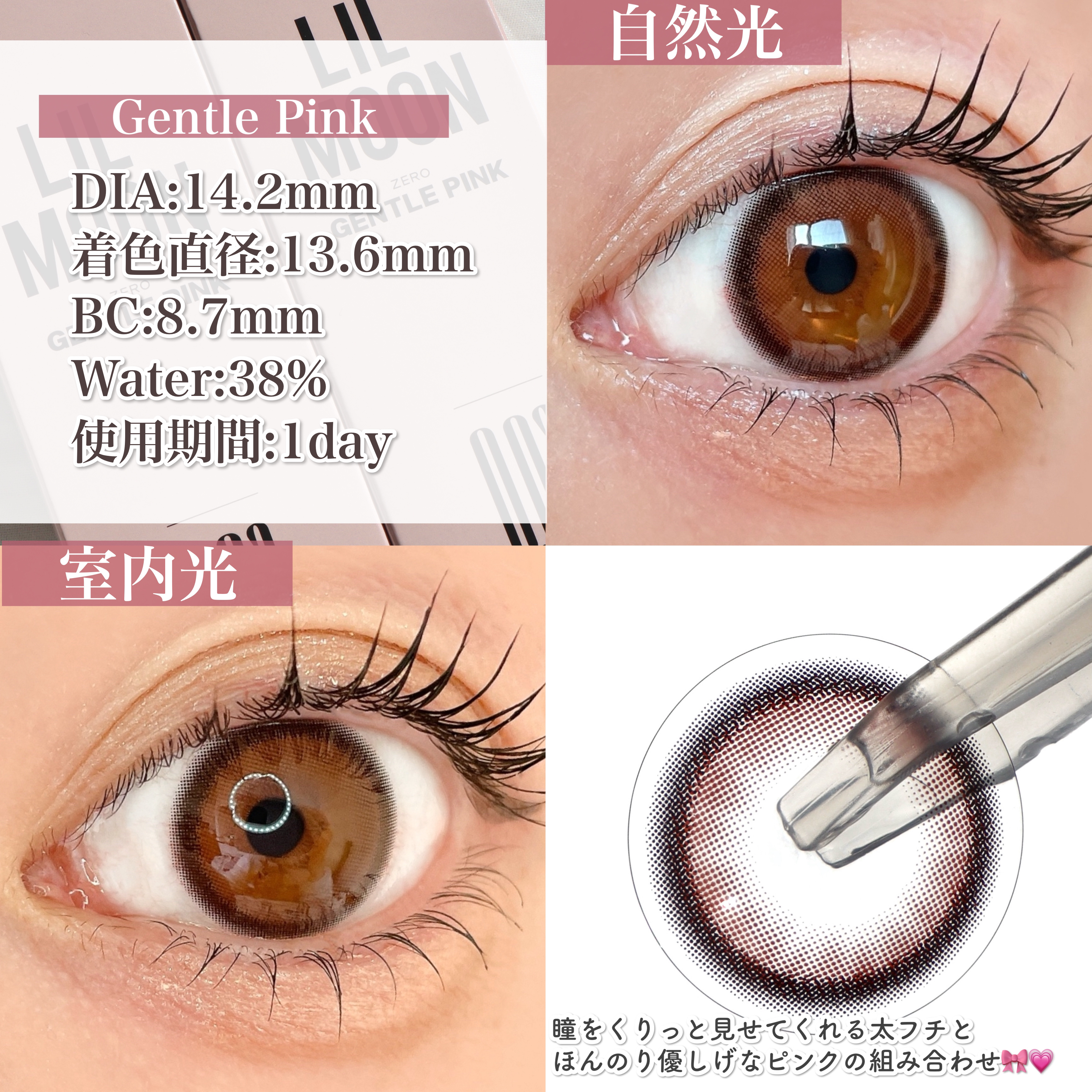 ちゅるんとした仕上がりが可愛すぎるLILMOON 1day 0.03ZERO👀 大きすぎず小さすぎない程よい着色直径と、透明感のある瞳を演出できるレンズデザインが可愛い🥹❤️ 裸眼暗めな私でもしっかり発色良く仕上がって、これはとてつもなく盛れるカラコンだなと思いました◎ 私はジェントルピンクがとくにお気に入り😍