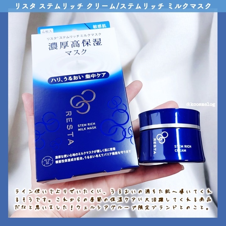 ウエルシアホールディングスとロート製薬共同開発の先端エイジングスキンケアブランド「RESTA(リスタ)」。30代からのお肌悩みを考え、ハリのあるうるおい肌に導いてくれるそう。 ステムリッチクリームはかなり軽い使用感で、ベタベタしないところが好き!冬の朝の保湿にぴったり。 ステムリッチミルクマスクは私の好きなクリーム系シートマスク。これめちゃくちゃ使い心地が良い!濃厚なミルクがヒタヒタに含まれていて、肌をやわらかく保湿してくれて心地良いです。