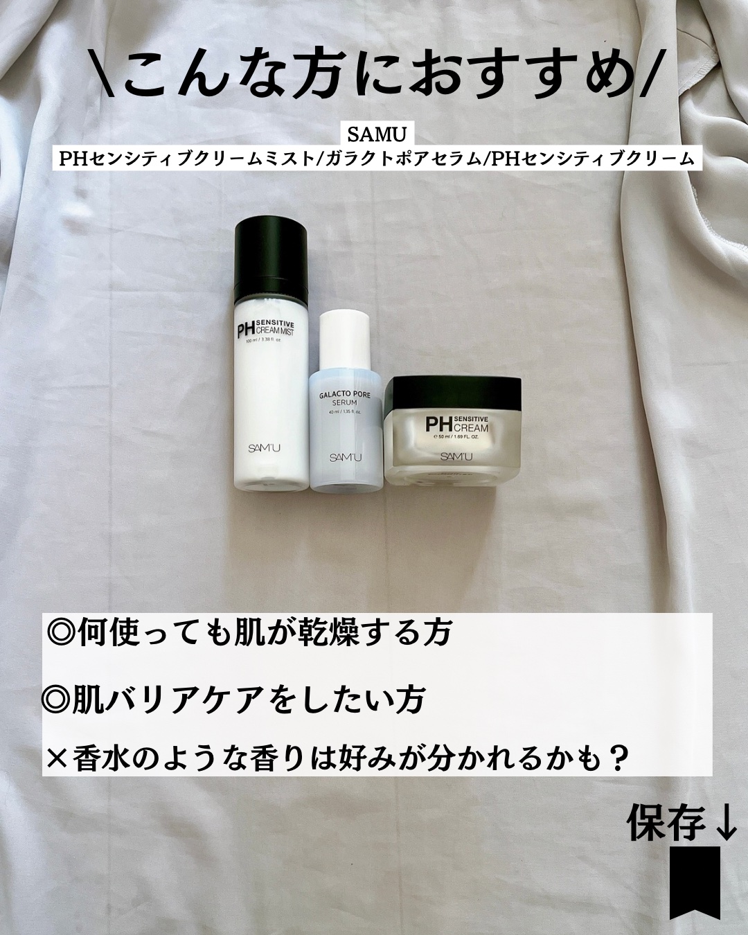 SAM'Uは敏感肌の方にもおすすめしたいブランド✨ 冬も肌バリア強化してうるおいあるお肌に♡♡ クリームミストは持ち運びにも便利✨ どれもしっとりうるおうのにベタベタ感もないのが嬉しい♥️ パケがオシャレなのも好き😍✨ メガ割終了までもう少し✨
