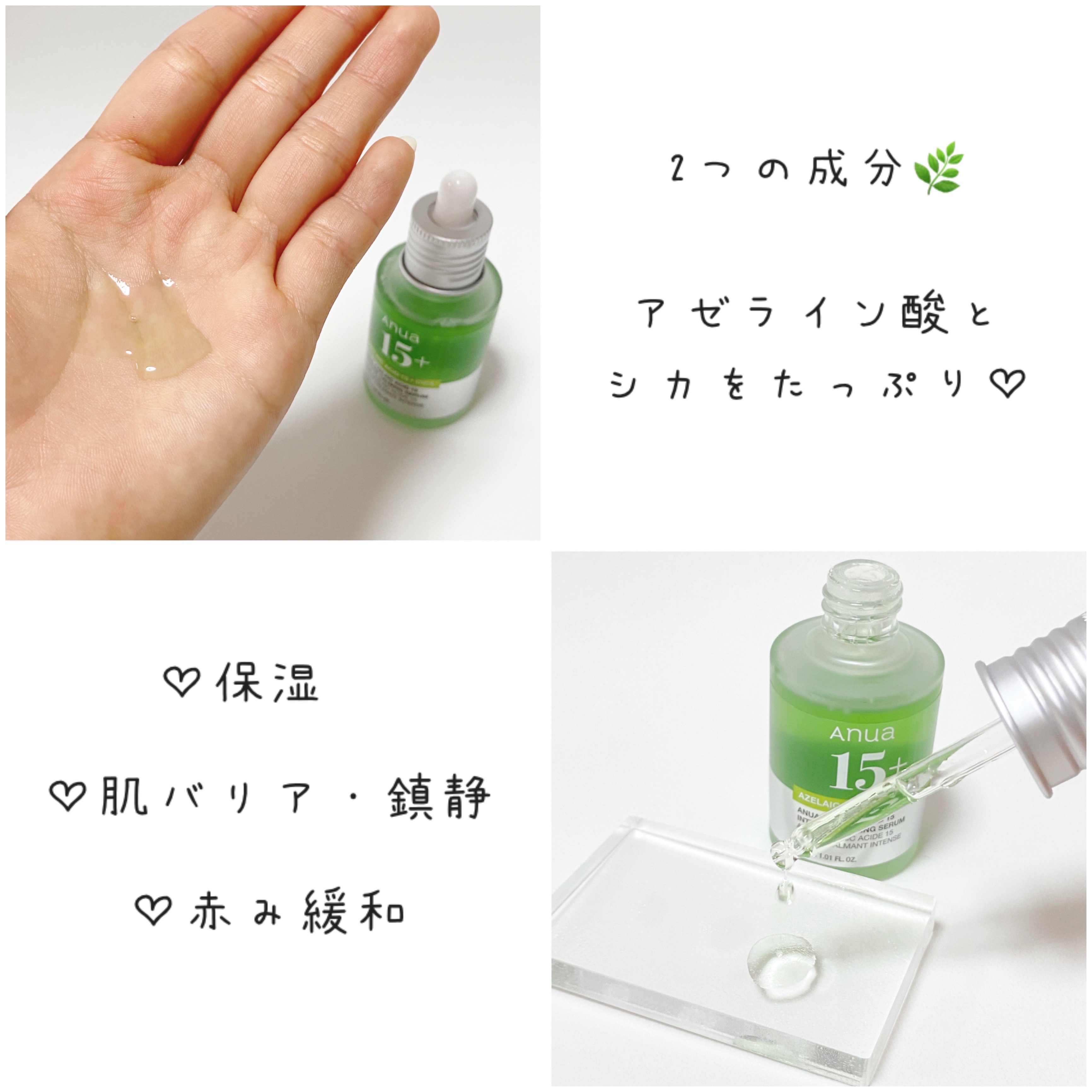 アゼライン酸15 インテンスカーミングセラムは、万能成分とも言えるほど様々な効能があるそう。ニキビや肌トラブルなどの炎症の緩和、過剰皮脂の抑制、角質ケア、毛穴の縮小、シミ・そばかす、ニキビ跡などの美白ケア等。 テカリが気になるオイリー肌の方にも役立つ。過剰な皮脂を抑えてくれるので、べたつく夏の肌にもピッタリ! 鮮やかなグリーンがキレイ💚 さらりとした軽いテクスチャーで、肌にサッとなじんで、夏でもさっぱりと使える。