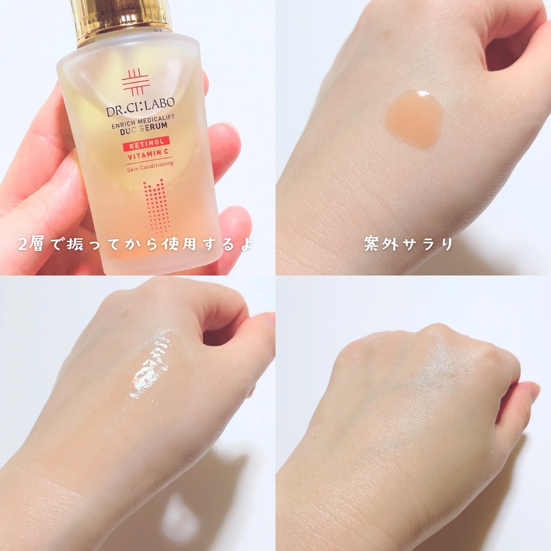 純粋レチノール*×ビタミンC*2 同時配合が難しい2の成分をドクターシーラボ独自処方の“2層式”によって実現💗 さっぱりとしたテクスチャだけど、ベタつきのないオイルでしっかり保湿を感じるよ︎︎⟡ クリニック発のブランドだから信頼感があるよね🎶