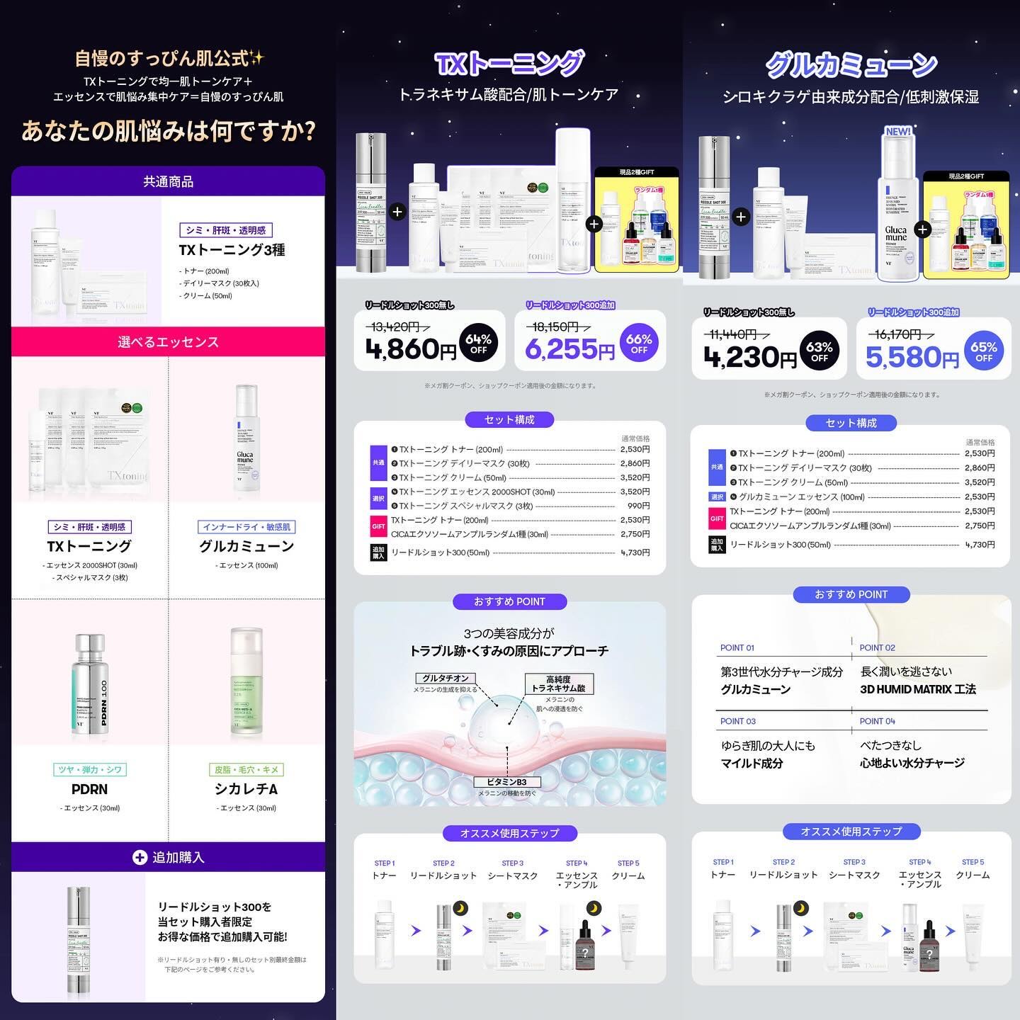 TXシリーズのトナー、デイリーマスク、クリームにお好みのエッセンスを4種類から選べるメガ割限定セット! 大人気のTXシリーズに加え、肌悩みに合わせたエッセンスを選べる嬉しいセット。 買うとTXトーニングトナー(現品)が1本おまけでついてくる!🫨❤️🔥