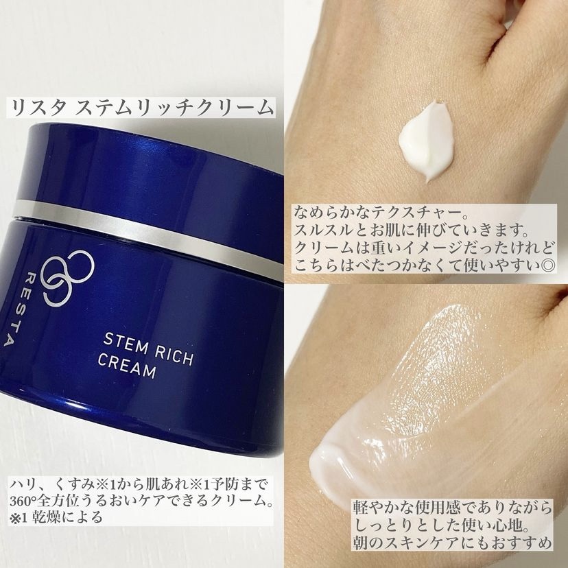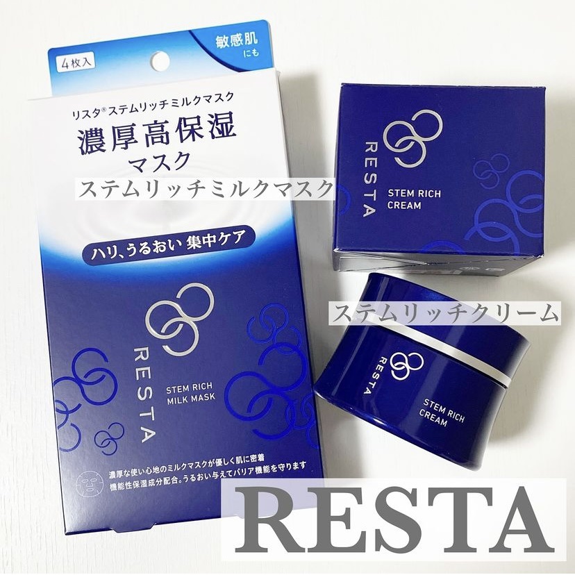 ウエルシアホールディングスとロート製薬共同開発の先端エイジングスキンケアブランド「RESTA(リスタ)」。30代からのお肌悩みを考え、ハリのあるうるおい肌に導いてくれるそう。 ステムリッチクリームはかなり軽い使用感で、ベタベタしないところが好き!冬の朝の保湿にぴったり。 ステムリッチミルクマスクは私の好きなクリーム系シートマスク。これめちゃくちゃ使い心地が良い!濃厚なミルクがヒタヒタに含まれていて、肌をやわらかく保湿してくれて心地良いです。