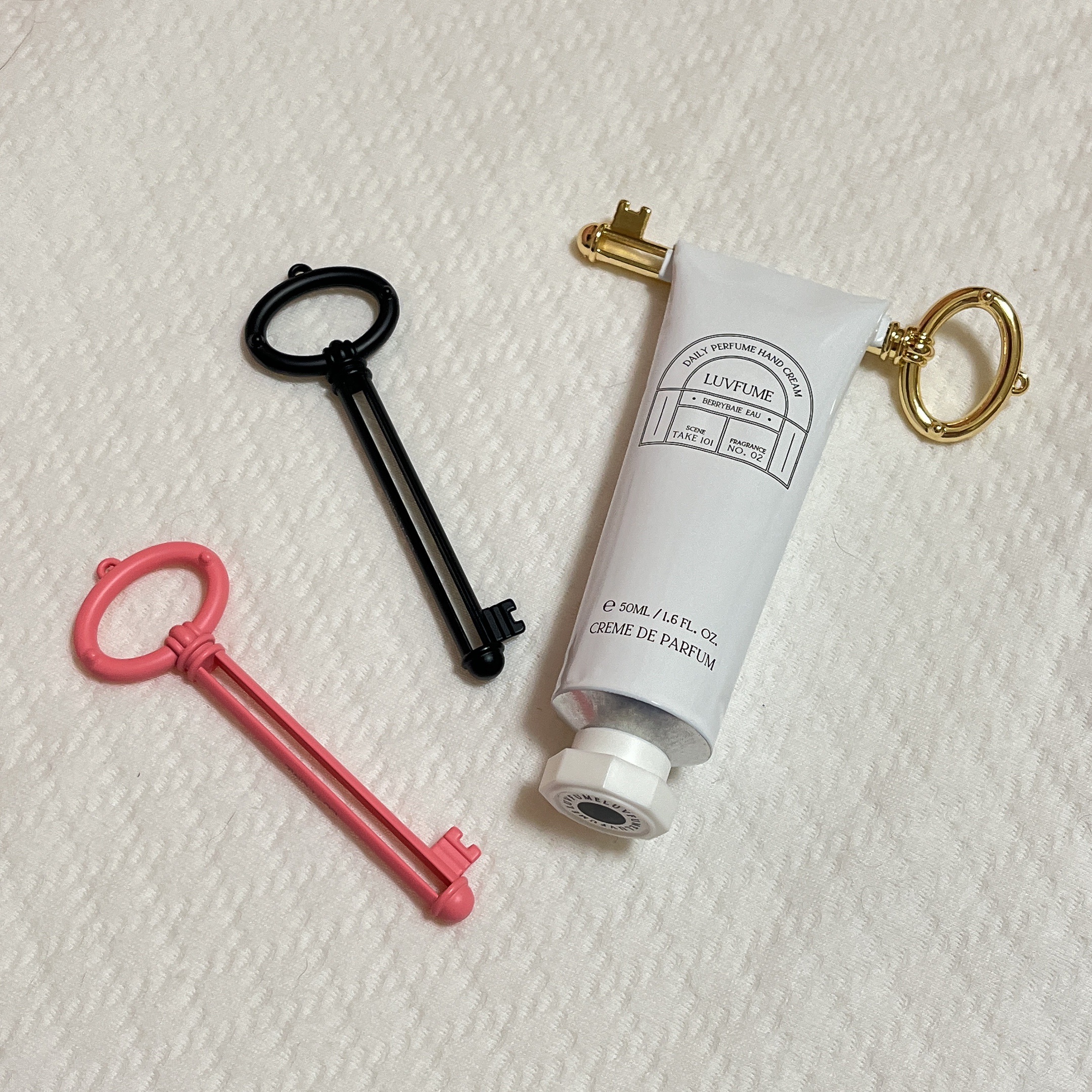 最後まで使い切りやす可愛い鍵🗝の形のスクイーザーのセットでバックなどにもつけてこまめに塗りやすいハンドクリーム✨ ホワイトフローラルとムスクがメインの香りで、手に馴染ませながらフワ〜っといい香りに包まれて癒される︎💕︎ こっくりめのテクスチャーなんだけど、ベタつき感が少なくてしっかり保湿!というタイプ✋