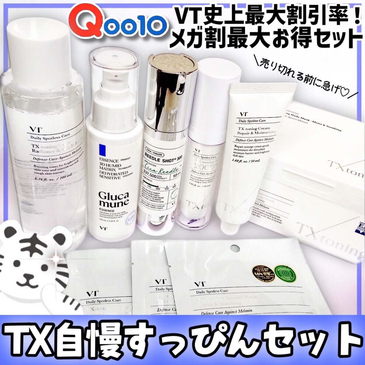 VT史上初!メガ割最大お得セットが登場したよ 売り切れる前にチェックしてみてね 話題の色素沈着ケア!TXトーニング4選に加えて肌悩みに合わせてエッセンスを選択できる! 敏感肌向けパッチテスト・乳幼児向け使用テスト済み (しかし、個人差があり、肌コンディションによって全ての方に肌荒れが起きないわけではありません。)