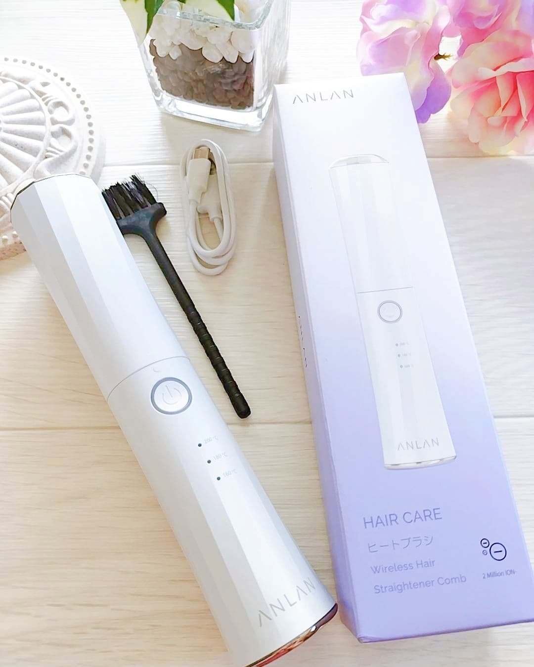 コードレス&軽量でどこでも使える超便利なヒートブラシ🔥 マイナスイオン効果で静電気とダメージを防ぎ、一台でストレート、カール、ブラシの三役に👏 160°C-180°C-200°Cの3段階で温度調整が可能なので、髪質に合わせて使えます☺️ おしゃれなデザイン&コンパクトなので、持ち運びでも全然邪魔にならないし、雨の日とかでスタイリングが崩れてしまっても外出先でぱぱっと手直し出来るのでありがたい🩷