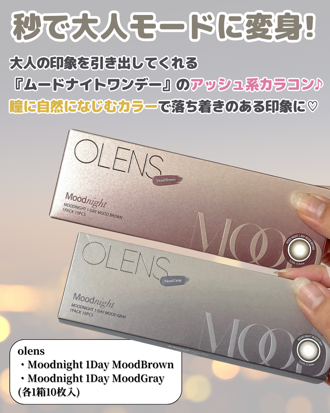- 韓国カラコン業界の話題のブランド『OLENS(オーレンズ)』の日本正式承認商品シリーズ。 世界中から注目を浴びるグループ「NewJeans (ニュージーンズ)」がイメージモデル。 OLENSから待望の新シリーズ「Moodnight(ムードナイト)」が新発売しました! 透明感と儚げな印象を与えるアッシュカラーで、グラデーションフチなので瞳に奥行きを与え大人っぽい目元を演出。 自然に馴染む13.3mmの着色直径でほのかに瞳の印象を変える裸眼風なナチュラルカラコンです。 シーンを選ばず誰でも使いやすいのでナチュラルカラコン好きにお勧めのシリーズです! ■OLENS Moodnight(オーレンズムードナイト) ・枚数:1箱10枚入り ・カラー :全2色 ■使い方 コンタクトレンズは高度管理医療機器です。必ず眼科医の処方に従って購入してください。 ■使用上の留意事項 コンタクトレンズは高度管理医療機器です。眼科医の指導に従い装用期間を厳守し、正しくお使いください。眼の定期検査を必ず受けてください。添付文書を必ず読み、取扱方法、装用時間を守って正しくお使いください。少しでも異常を感じたら、直ちに眼科医の検査を受けてください。