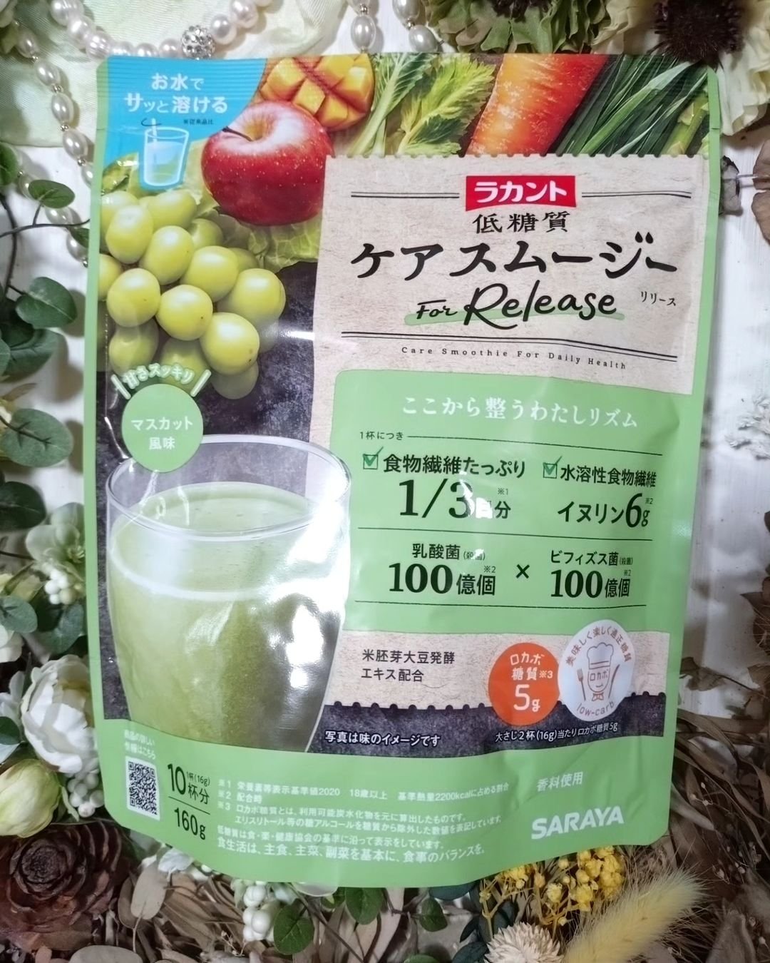 ラカントで有名なサラヤさんのスムージーです。私はリリースのマスカット風味を使用です🍇 美味しいのに、食物繊維、乳酸菌、ビフィズス菌が摂れるのは凄く魅力的✨ 忙しい朝や栄養が偏っていると感じている時に、サッと飲めて栄養補給出来るの嬉しい💕