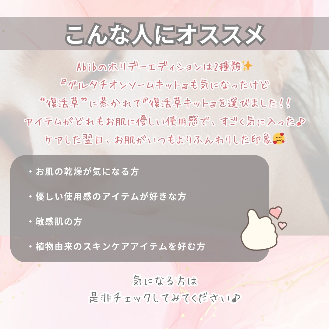 11月15日Qoo10メガ割でAbibからホリデーエディションが発売😊🌿 復活草キットは、香りも気にならないしベタつかないからめちゃくちゃ使いやすい😉✨ 肌の悩み別に選べるよ🤗!