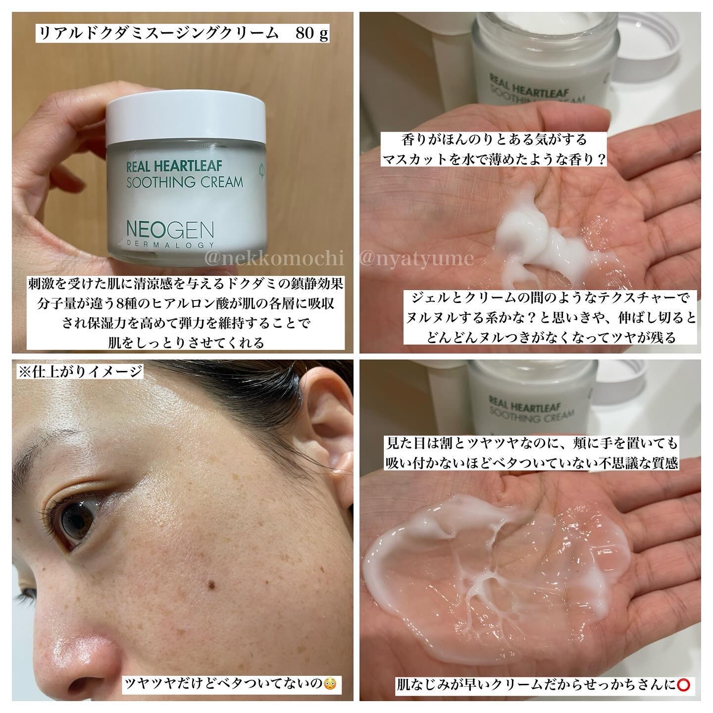 敏感な肌にドクダミがいい♪ NEOGENのリアルドクダミスージングクリームを使ってみました🕊️ やわらかなジェルクリームのようなテクスチャー。ベタつきは少なめだけど膜を張ったような保湿感があります。 分子量が違う8種のヒアルロン酸が保湿力を高めて弾力ケア!肌に水分を届けるジェル水分クリーム♡