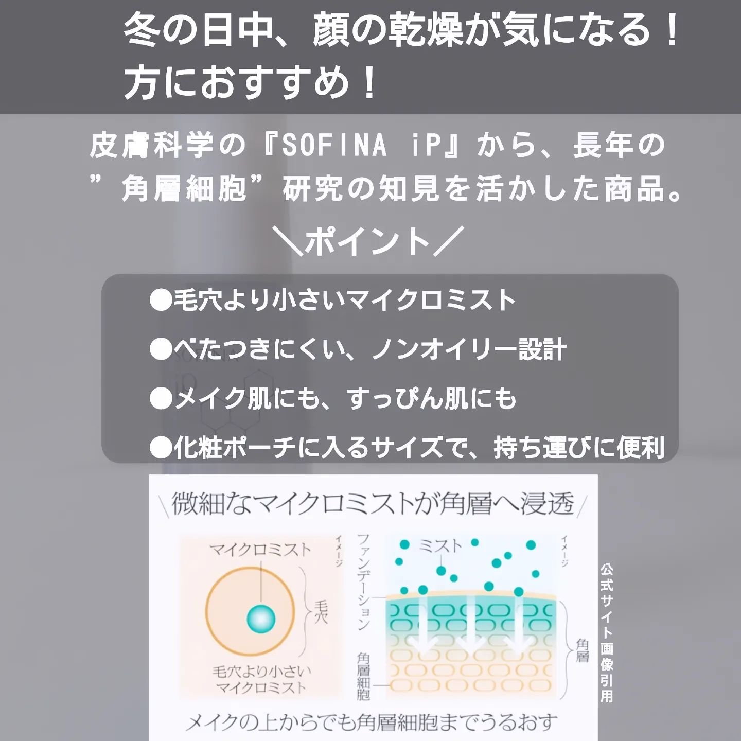 メイクの上から手軽に水分補給ができるうるおい秒ミストで、乾燥した季節を乗り越えましょう! メイクしたまま角層細胞まで補水するポータブルミスト! 日中に持ち運ぶ用に購入してみたのですが、朝使うと夕方までしっかり保湿されるのでほとんど追いミストすることがありません。