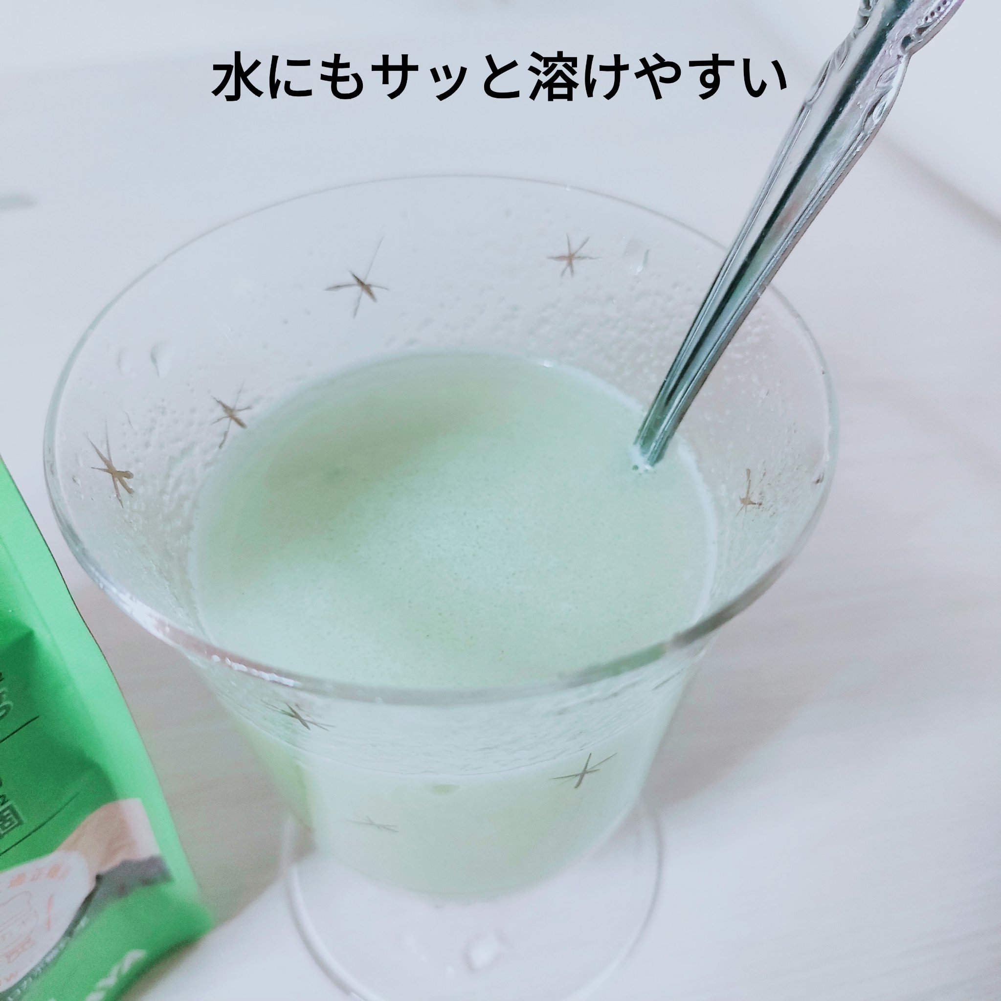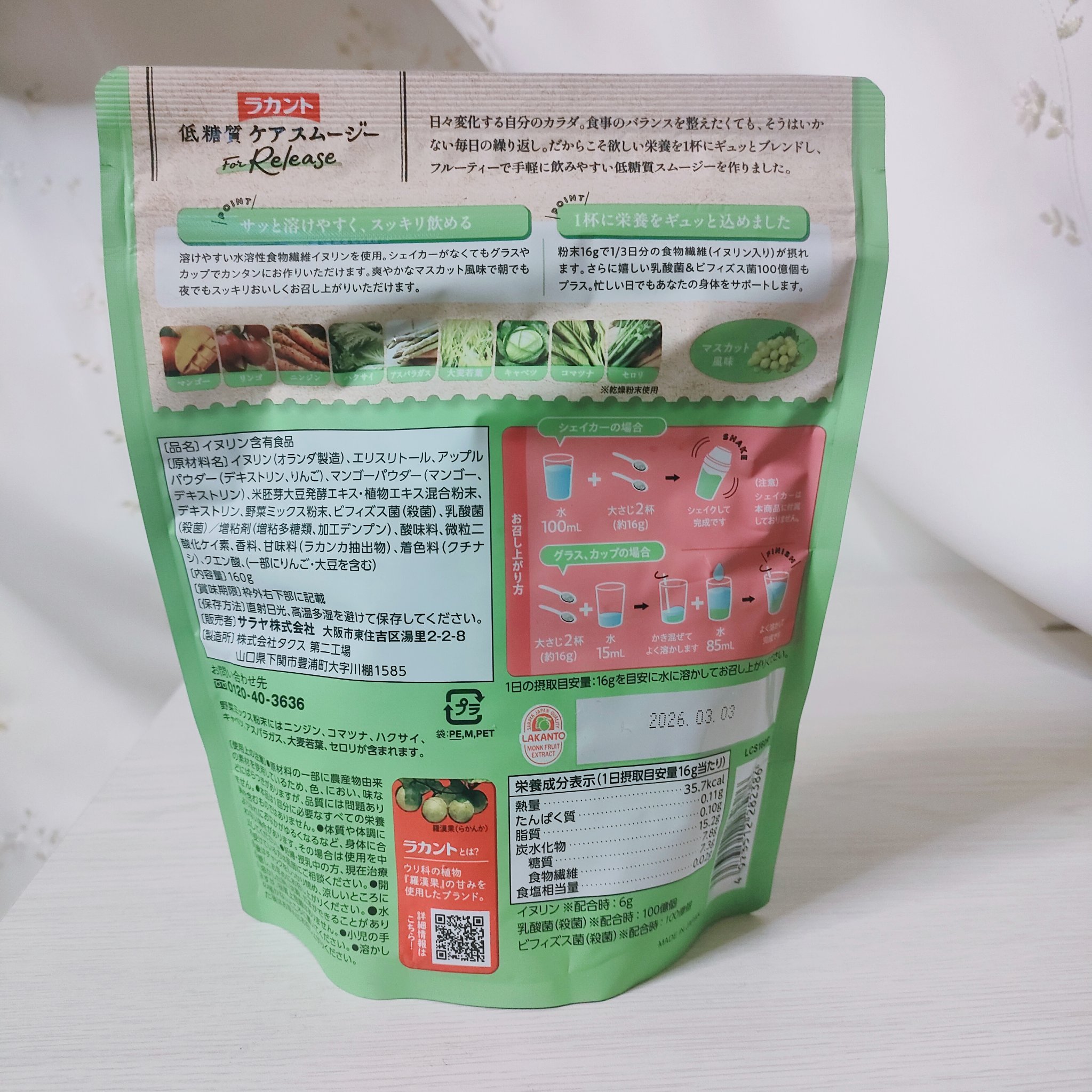 手軽においしくいただける粉末スムージーだよ〜!時間がないときとか、ちょっと小腹空いたな〜ってときに、今こちらを召し上がっています♡ 袋を開けてみると、細かいパウダーがたっぷり。使用方法は2種類あるよ〜! マスカット風味で甘いんだけど、最後はさっぱりしてて美味しい〜♡
