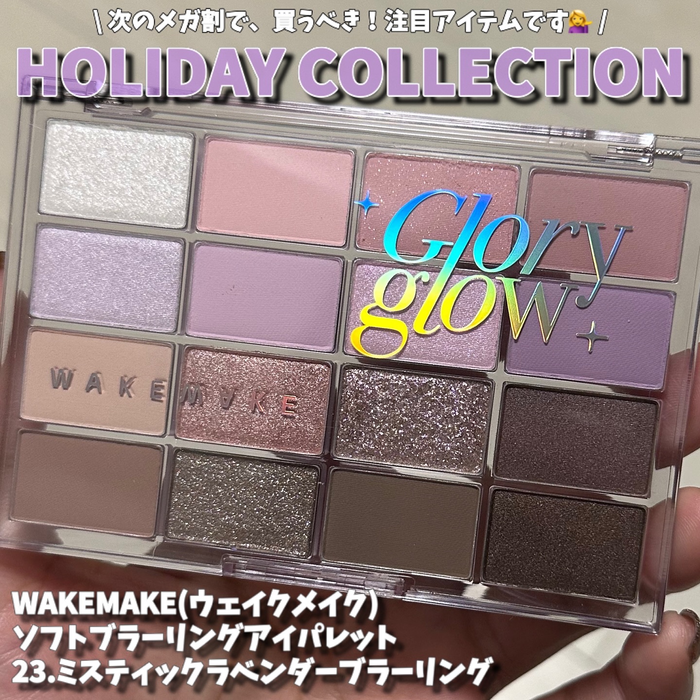 キラッキラ!透明感!神秘的!! って感じの可愛すぎるアイシャドウパレットホリデーをメガ割で購入しました! 透明感パープルとピンクラベンダーカラーに影色ベージュブラウンなどが合わさってめちゃ使いやすいかも 密着感も高めのアイシャドウ。チークやハイライトにふんわり使うのもおすすめです!