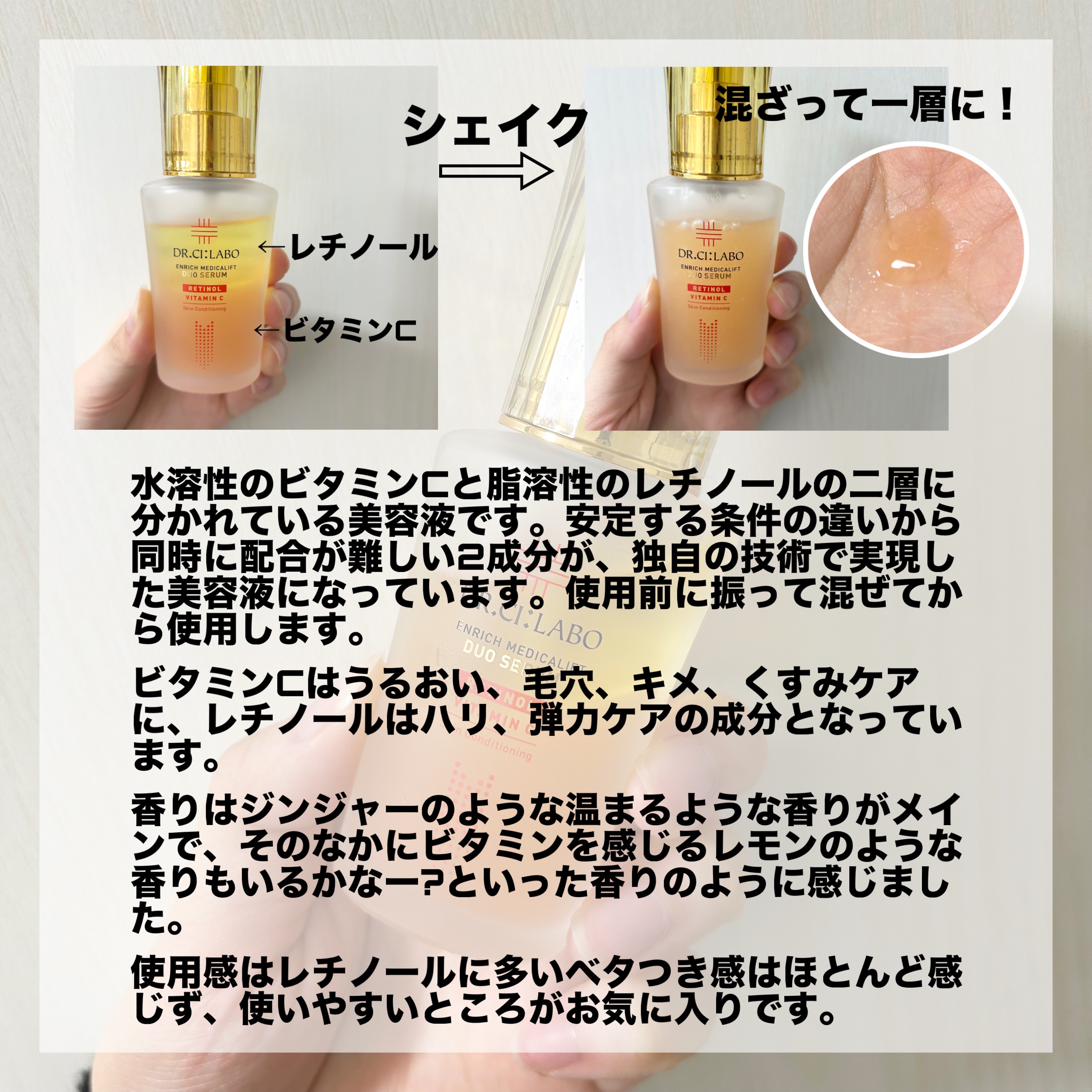 純粋レチノール*とビタミンC**が一つの瓶に入った画期的な美容液! 同時に配合するのが難しい2種類の成分をシャカシャカ振り混ぜるだけで両方の効果が期待できます! なかなか純粋レチノール*とビタミンC**を一度に取り入れられる美容液って見かけないので、ハリやツヤが気になる方におすすめです!