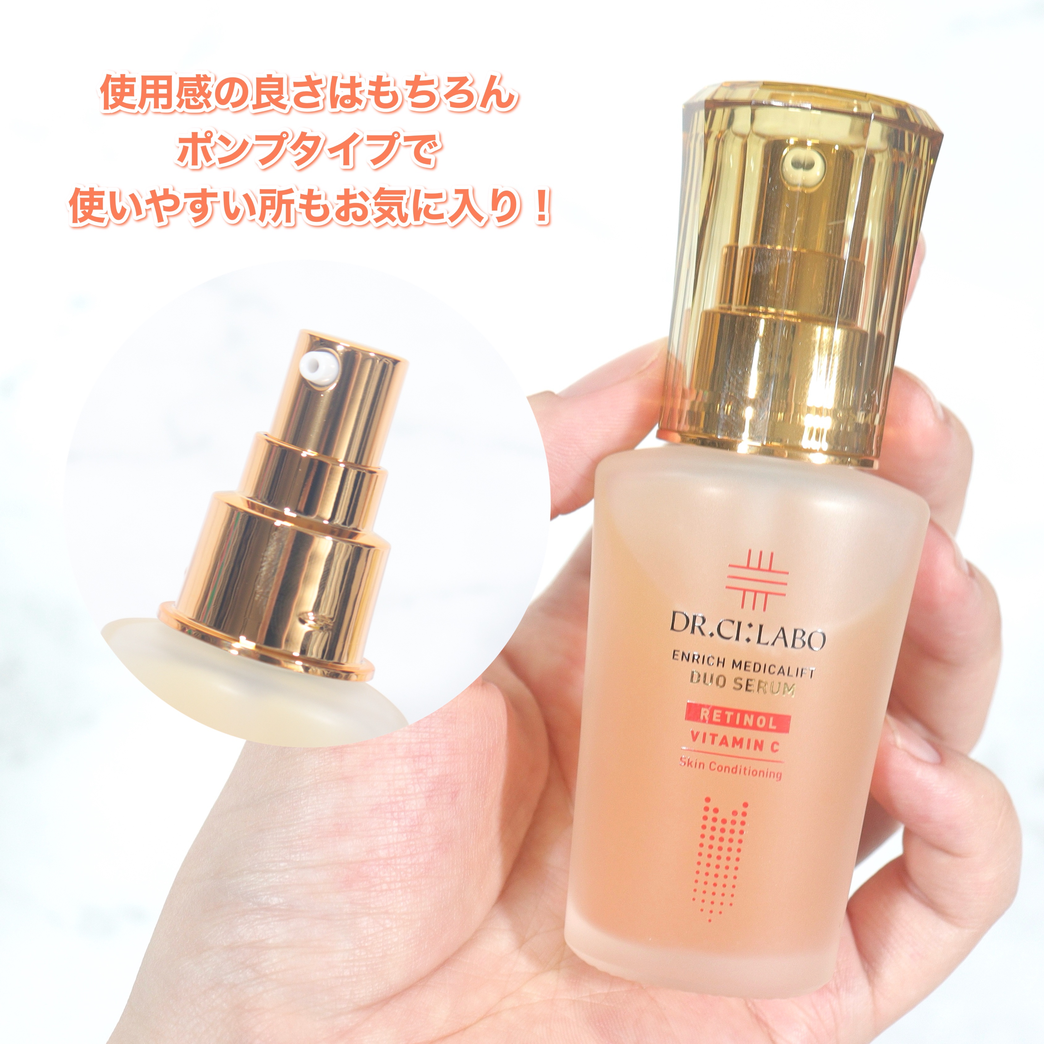 エイジングサインにアプローチする 純粋レチノール*1ビタミンC*2 配合のドクターシーラボのセラム 同時配合が難しい2大成分をドクターシーラボ独自処方2層式によって実現。 使う直前に混ぜて使うから 2層それぞれの成分をフレッシュな状態で使える◎