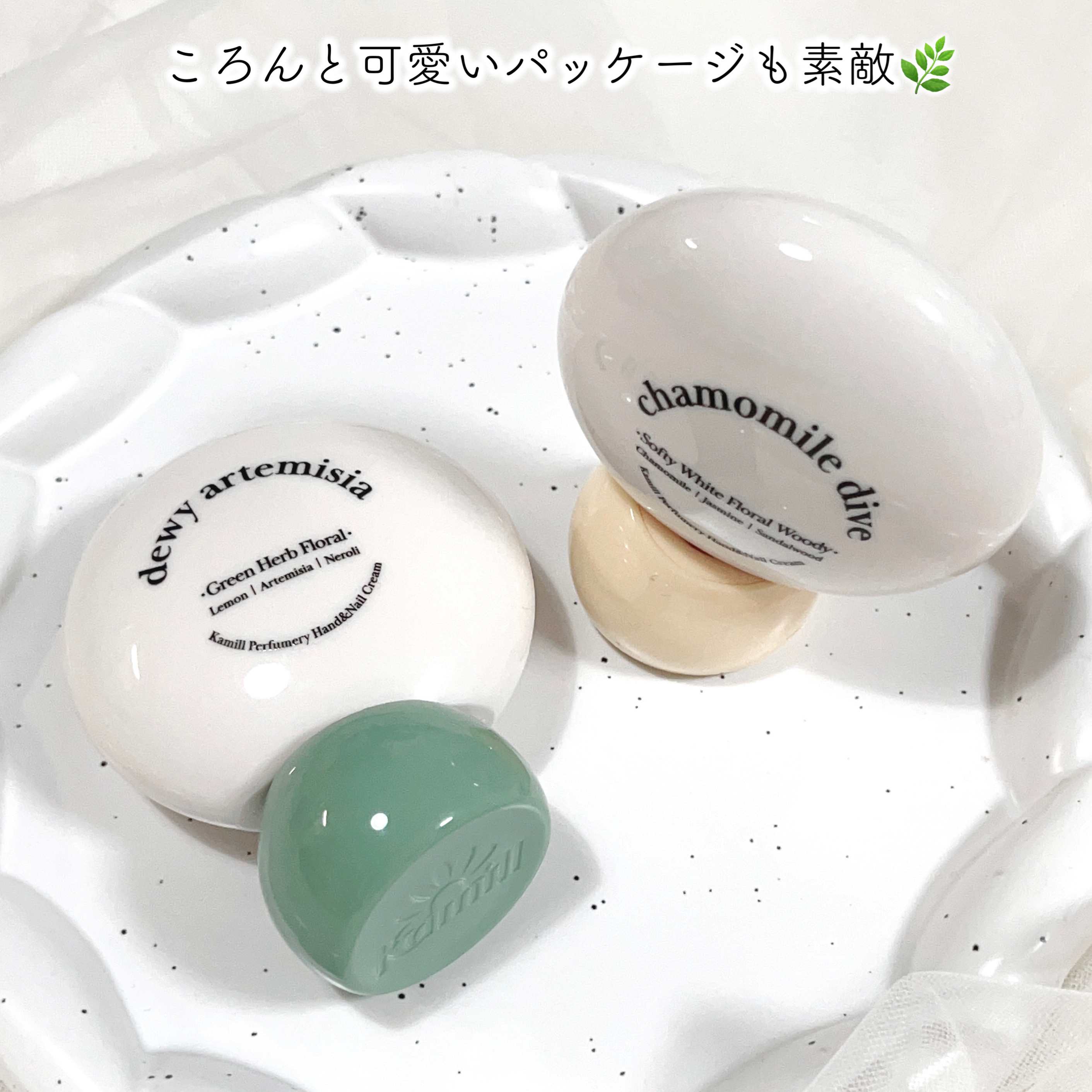 ころんとしたパケが可愛いハンドクリームです!こちらは6種類の植物オイル配合で肌の鎮静と保湿をしてくれるそう! 🌟デューイアルテミシア 清楚でほのかなグリーンハーブの香り 実際に使用してみると、柔らかくて伸びのいいクリーム。どちらも香りがふわっと香る✨