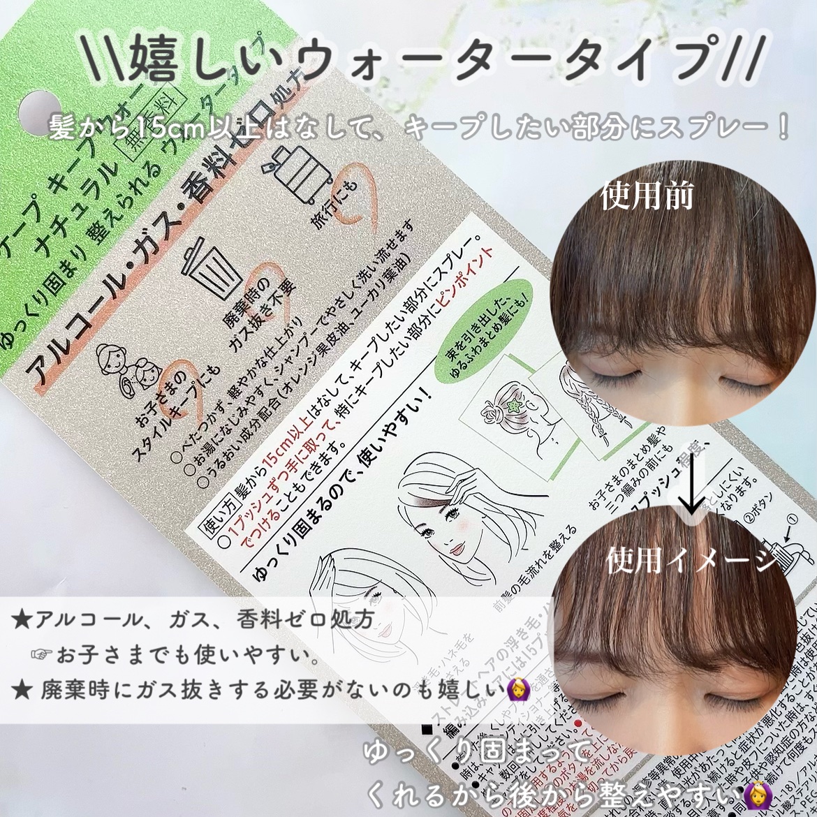 - アルコール、ガス、香料 ゼロ処方。 ゆっくり固まり、整えられるウォータータイプのヘアスプレー。 ヘアスタイルを自然な感じにキープ。 ベタつかず、軽やかな仕上がり。 アルコール・ガス不使用で、ニオイが気になりません。 お子さまのスタイルキープにも! 廃棄時のガス抜き不要。 旅行にも持っていきやすい。 お湯になじみやすいので、シャンプーでやさしく洗い流せます。 うるおい成分配合(オレンジ果皮油、ユーカリ葉油) ●無香料