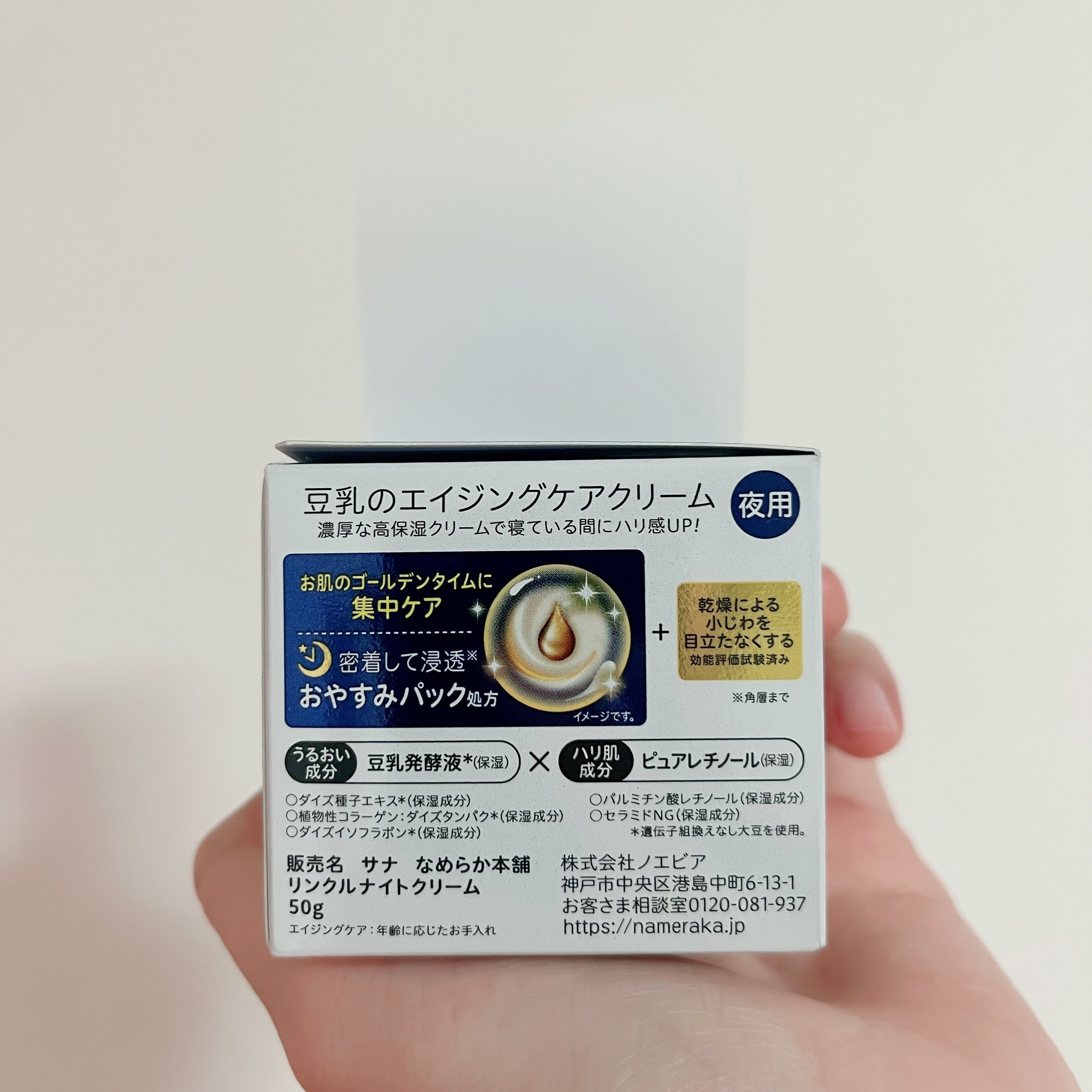 - リンクルラインからナイトクリームが新登場! ピュアレチノール*1を新配合の濃厚クリームが一晩かけて密着して浸透*2する、おやすみパック処方です。 商品特徴 〔 ①ピュアレチノール*1×豆乳発酵液*1配合で本格スキンケア 〕 『なめらか本舗』オリジナルのイソフラボン含有の豆乳発酵液*1に加え、ピュアレチノール*1を新配合! お肌にハリ・弾力感を与えます。 〔 ②夜のしっかりケアで乾燥による小じわを目立たなくします*3! 〕 肌ストレスの少ない夜のお手入れをおすすめします。 新登場のナイトクリームはおやすみパック処方を採用し、濃厚なクリームが一晩中肌に密着しつつ、乾燥による小じわ目立たなくします。 〔 ③3ステップの重ね技ケア! 〕 化粧水、乳液も新テクスチャーで保湿感がパワーアップ! リンクルライン3品一緒に使用するのがおすすめです。 *1 保湿成分 *2 角層まで *3 効能評価試験済み