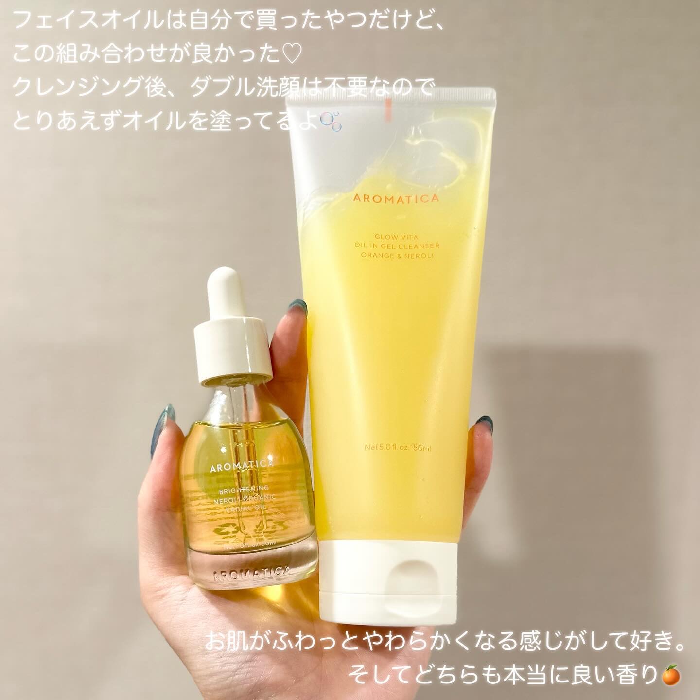 ジェルなのにお肌に乗せてなじませる瞬間にオイルなテクスチャーになる ほんと不思議なクレンジングジェル💡 オレンジ&ネロリの香りがすごくうっとり! 洗い上がりはしっとり系。W洗顔不要なんだけど、気になる人はW洗顔してもOK✨