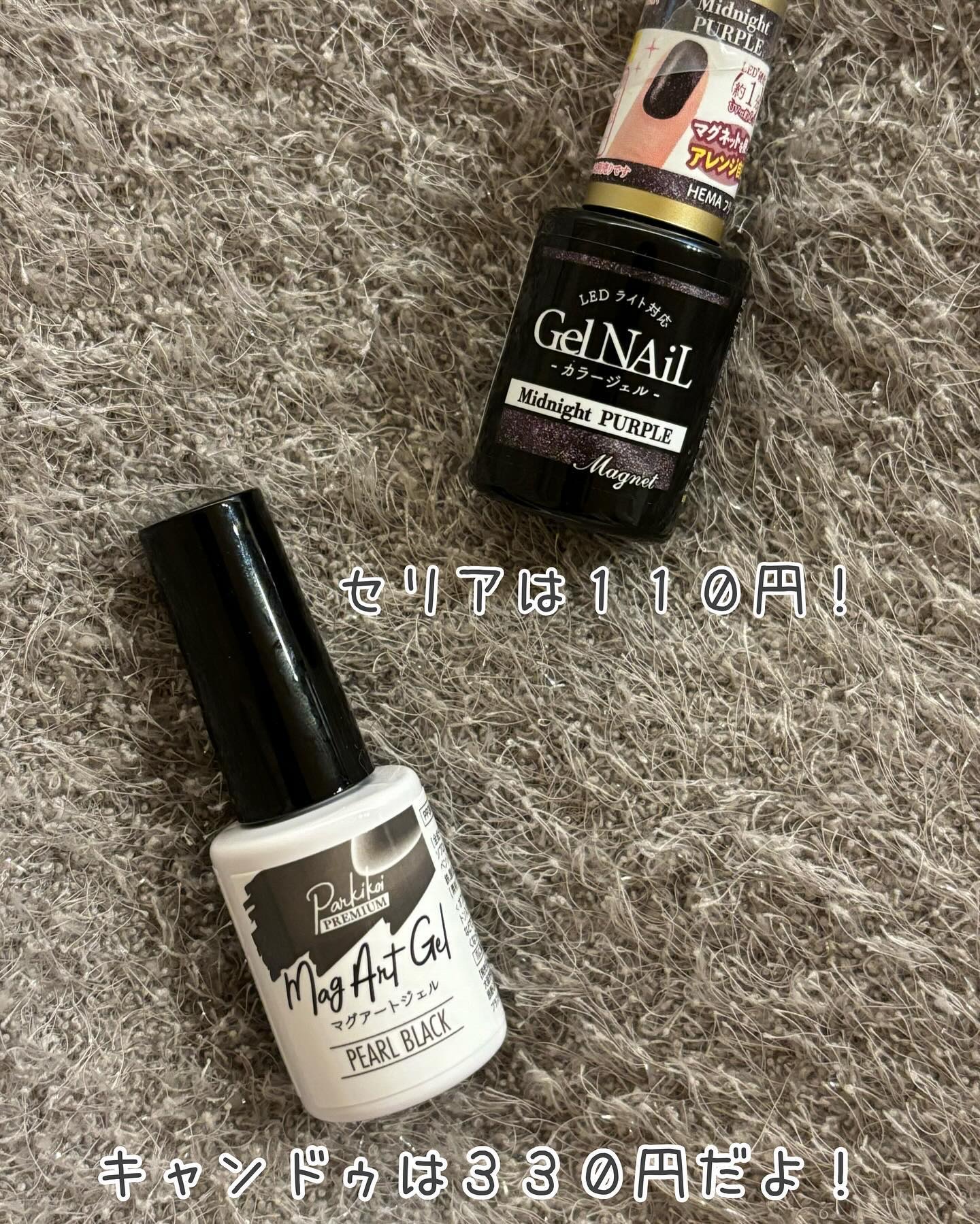 セリアのマグネットジェルは税込110円の最安値! 昨年の秋ごろ発売のカラーからリニューアルしてラメの動きがよくなっています✨ 最初に紹介した6つはリニューアルしたカラーで、 昨年発売のリニューアル前のカラーとは色味が全然違うので要注意!ラメの...