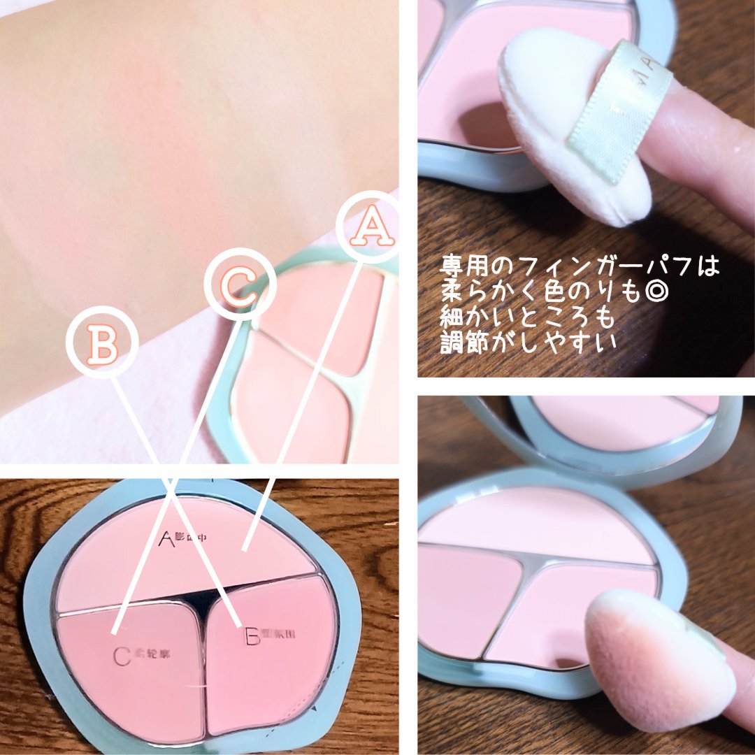 - 「膨張色+メインカラー+収縮色」の三色一体型チークパレット。 異なる明度と彩度の色で自然なグラデーションと立体感を作ることが可能。単色で使用すれば様々な雰囲気のメイクが楽しめ、違う色を重ねて使用すると、三色が程よいバランスで雰囲気と立体感を作り出す。